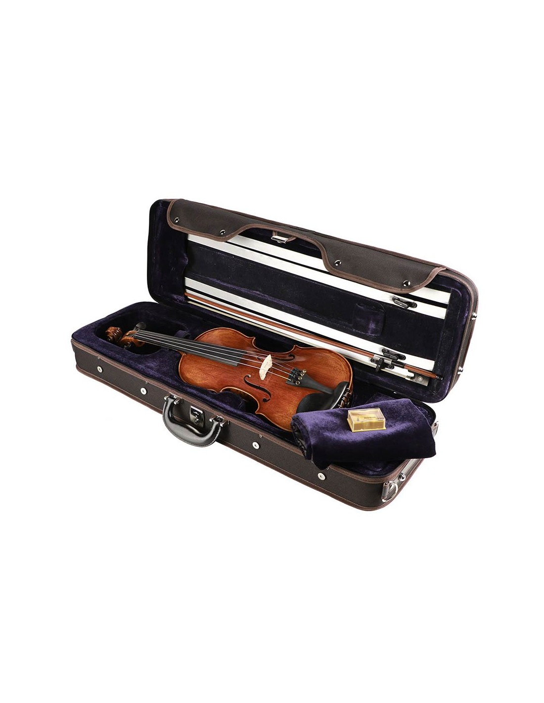 Leonardo Maestro series violin outfit 3/4 all solid oil varnish very well flamed ebony fittings oblong case bow finetuners tailpieceViolin with quality spruce top and quality very well flamed maple back sides and neck. Varnished with dark brown lack for