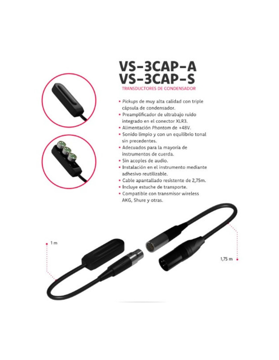 Los VS-3CAP-A y VS-3CAP-S  son un novedoso transductor de vibración compuesto por tres micrófonos de condensador de muy bajo ruido, encerrados en una cápsula hermética en disposición lineal. Esta disposición de las capsulas consigue una mayor superficie de captación del instrumento, a la vez que una respuesta mejorada rica en armónicos y un equilibrio tonal superior en comparación con otros sistemas que utilizan una sola capsula lográndose así, una calidad de audio  y un alto rango dinámico, sin precedentes hasta ahora en este tipo de micrófonos.