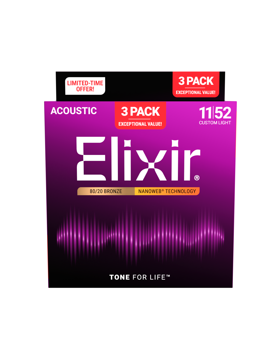 ¡Compra 2 juegos y llévate 1 más de regalo! El pack Elixir 16539 incluye tres juegos de cuerdas para guitarra acústica con entorchado en bronce 80/20 y recubrimiento Nanoweb. Estas cuerdas están diseñadas para ofrecer un tono brillante y definido, con una durabilidad superior frente al desgaste habitual gracias a su capa protectora ultrafina, exclusiva de Elixir.