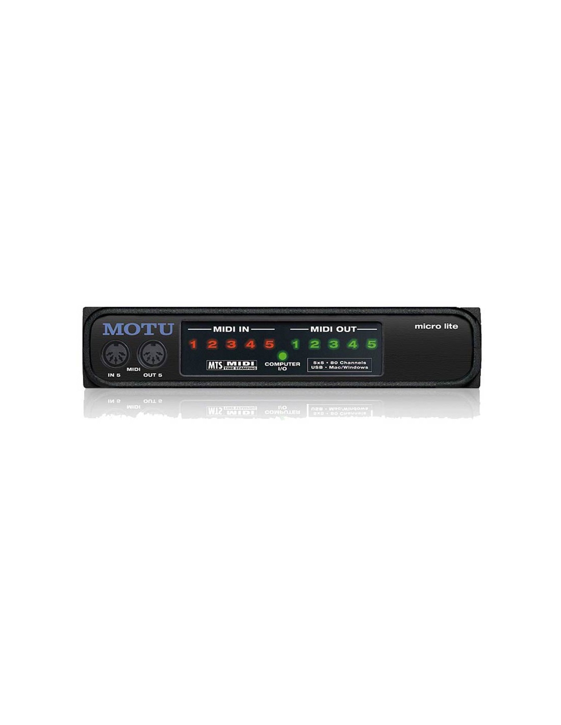 INTERFACE MIDI-USB Interface MIDI de 80 canales • 5 MIDI in 5 MIDI out • Conectable vía puerto USB para PC/MAC • Expansión - Los interfaces MIDI de MOTU crecen contigo.Expandirlos es simple. Añade puertos MIDI adicionales conectando nuevos interfaces MIDI MOTU. Compatibilidad - Trabaja con tu software favorito sin problemas. Se incluyen drivers para Mac OS9 y Mac OS X y también para Windows Me/2000/XP. Conexión USB de alta velocidad. USB-Powered - Se alimentan desde el puerto USB • Todos los interfaces MOTU usana fondo las características de alta velocidad de los puertos USB consiguiendo una precisión de tiempo de sub-milisegundos y una perfecta sincronización de los eventos MIDI. Además con funciones de conexión en caliente de gran utilidad