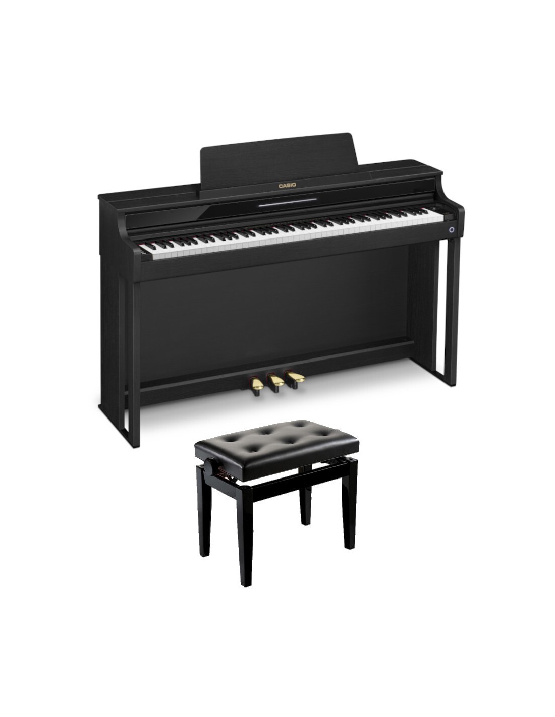 PIANO DIGITAL 'El Celviano AP550, la última incorporación a nuestra línea de pianos, fusiona la autenticidad distintiva de un piano de cola con la comodidad de tocar en casa. Su conjunto de sonidos versátiles se adapta de manera fluida a diversas canciones y estilos, brindando la flexibilidad necesaria para personalizar cada interpretación. El sistema de sonido del Celviano AP550 está meticulosamente diseñado para emular la resonancia natural de un piano de cola, ofreciendo así una experiencia auditiva excepcionalmente realista. Además, el teclado eleva la experiencia de interpretación al combinar la mecánica de acción de martillos con la avanzada tecnología de control digital. El sistema de tres pedales, cuidadosamente diseñado, captura con precisión las sutilezas que definen a un piano de cola. Con sus funciones innovadoras, el Celviano AP550 no solo redescubre el placer de tocar el piano, sino que también logra un equilibrio perfecto entre funcionalidad y estilo.Características destacadas:Teclado Smart Hybrid Hammer Action Celviano Edition, construido en madera y resina.Fuente de sonido Multidimensional Morphing AiR256 voces de polifonía26 sonidos6 sonidos Grand PianoFunciones Layer y SplitSimulación acústica: liberación de teclas, resonancia de cuerdas y apagadores, ruido de teclas, pedales y apagadores, simulación de tapa.Efectos: Simulación de sala, Reverb, Surround, Chorus, Brilliance, DSP.60 canciones Music LibraryModo lecciónConcert Play con acompañamiento de orquesta mediante app CASIO MUSIC SPACEGrabación de audio y MIDIInstant Replayer 270 segundosModo DuetTranspositorCambio de octavaMetrónomo3 pedales: sustain variación continua, soft 2 niveles, off, sostenutoSustain con modo medio pedalBarra de información visualTapa superior accionable como en un piano acústico2 salidas de auricularesPuertos USB Tipo A y BAudio y MIDI inalámbricos mediante adaptador WUBT10 incluidoCompatible con aplicación CASIO MUSIC SPACESistema de sonido: 2 canales / 4 altavoces, 20W 20WColores disponibles: Negro, Palisandro nuevo acabado, BlancoElementos incluidos: Adaptador inalámbrico WUBT10, atril, adaptador AC, gancho para auricularesDimensiones: 1,401 x 440 x 891 mmPeso: 49,5 kgBanqueta de madera para piano regulable en altura. Tapizada en skay negro. Modelo BGM madera en acabado satinada. Altura ajustable entre: 47cm y Altura máxima de: 55.5cm aprox Medidas aproximadas: Alto : 45cm / Ancho : 54.5cm / Profundo : 32.5cm'