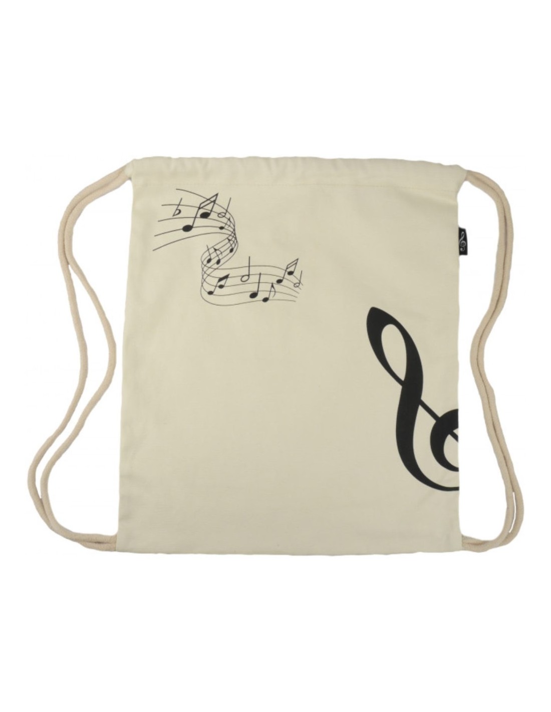 Bolsa tipo saco natural con adorno Clave de Sol. Este modelo está impreso por ambas caras e incluye cierre con cordón.44x37 cms