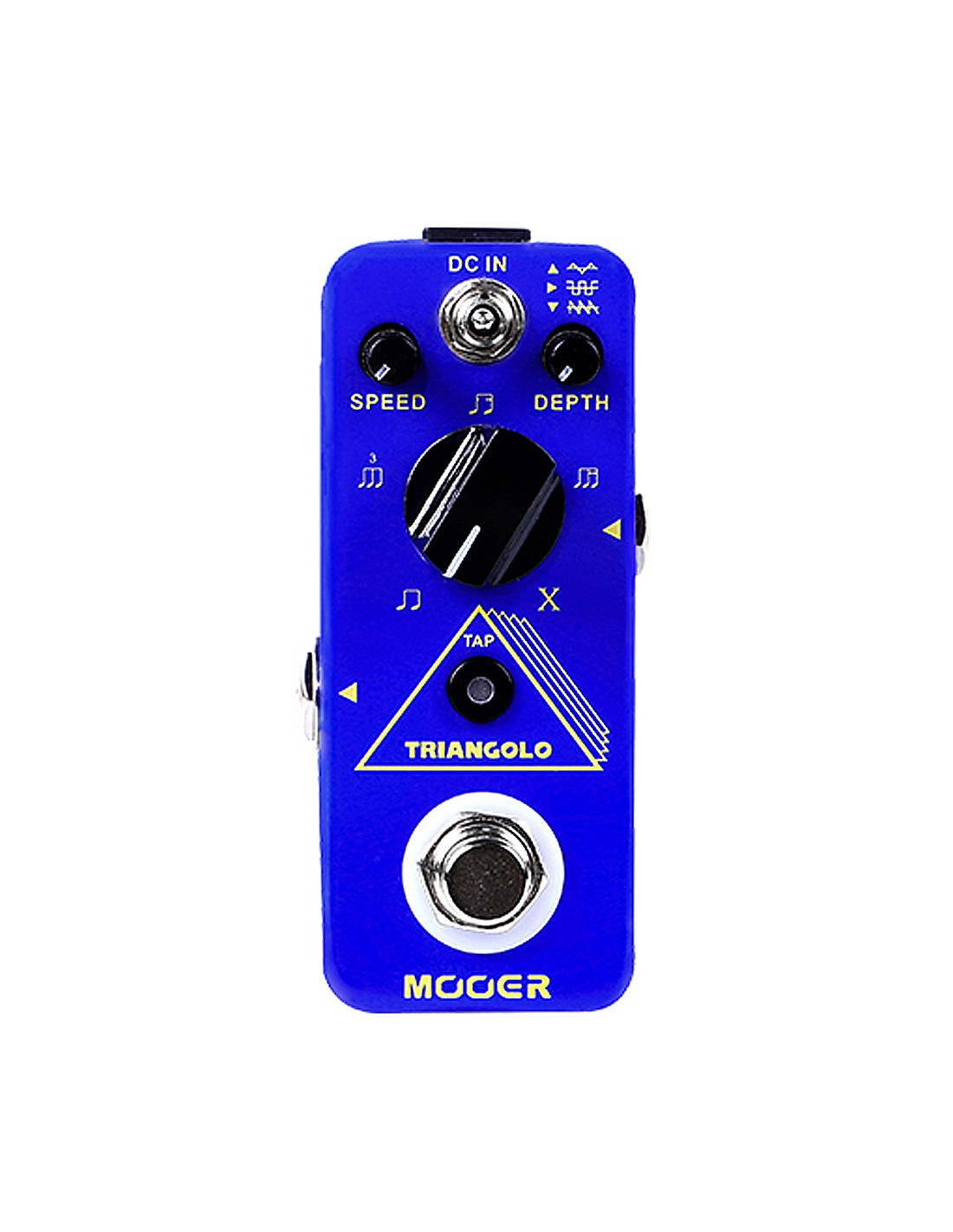 PEDAL DE TREMOLO Pedal trémolo con nuevos y avanzados algoritmos que lo diferencian del resto de trémolos. Tiene un switch con el que puedes seleccionar 3 tipos de trémolo: Triangular, Square y Saw Tooth. El control Depth te permite ajustar la intensidad y con el Speed la velocidad. Tiene un control de sub-división de patrones rítmicos para que tengas un control real de Tap Tempo, si lo ajustas al máximo llegarás a X donde llegarás a un trémolo totalmente descontrolado y repetitivo para que experimentes con tu público. True Bypass.