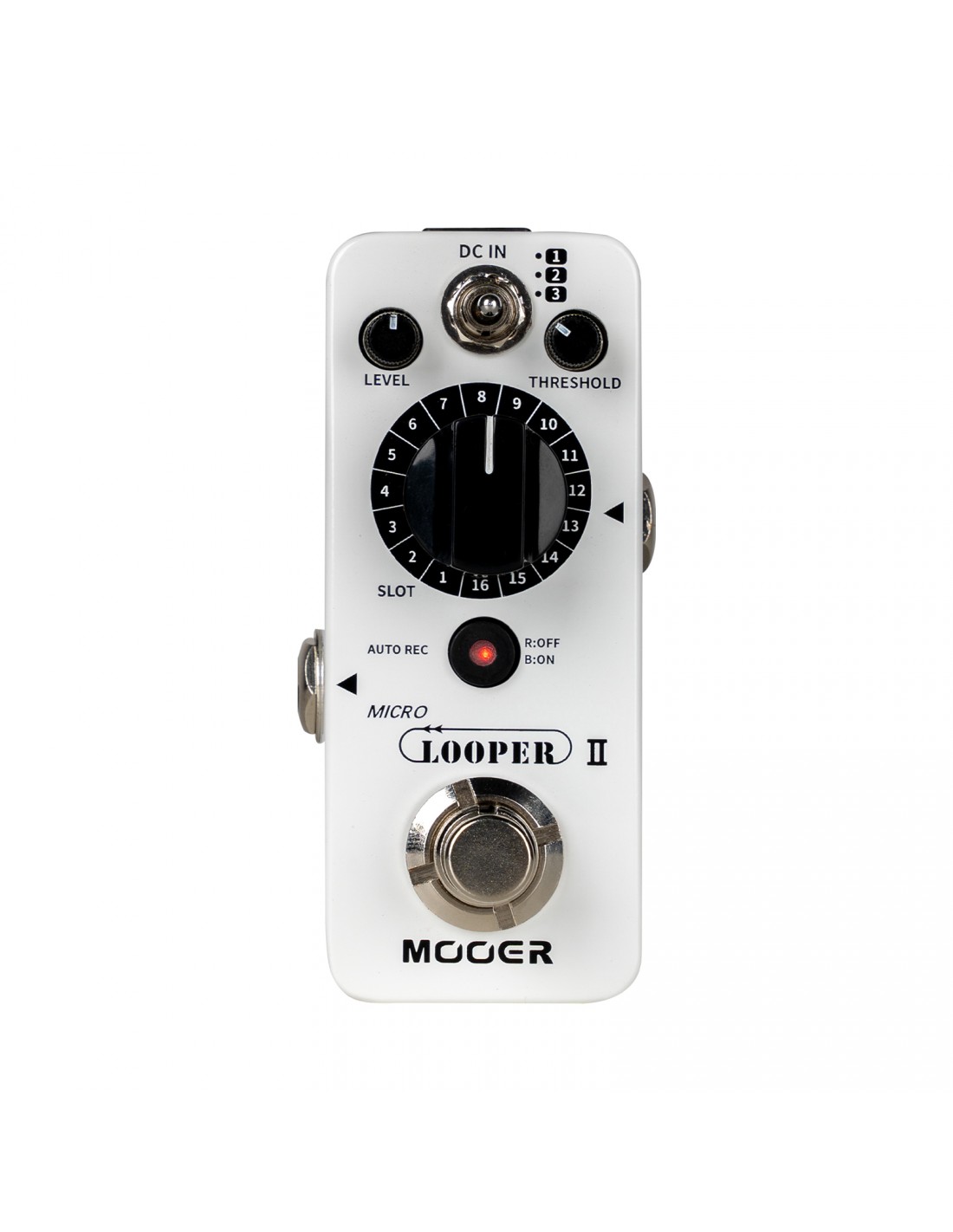 PEDAL DE FRASEO/LOOPING Con tres bancos de almacenamiento y 16 ranuras por banco, el Micro Looper II con múltiples slots de almacenamiento ofrece a los usuarios hasta 480 minutos de tiempo de grabación, con cada slot proporcionando hasta 10 minutos. El pedal también incluye capas de grabación ilimitadas, lo que permite a los músicos crear fácilmente bucles complejos y por capas.Con su función AUTO REC, el Micro Looper II inicia automáticamente la grabación en cuanto detecta una señal de entrada, lo que facilita la captura de ideas musicales espontáneas sin tener que pulsar ningún botón. Características- Pedal Micro Looper II con múltiples slots de almacenamiento- Tres bancos de almacenamiento con 16 slots para cada banco- Hasta 10 minutos de grabación por cada slot, 480 minutos en total- Capas de grabación ilimitadas- AUTO REC para iniciar la grabación automáticamente cuando se detecta la señal de entrada