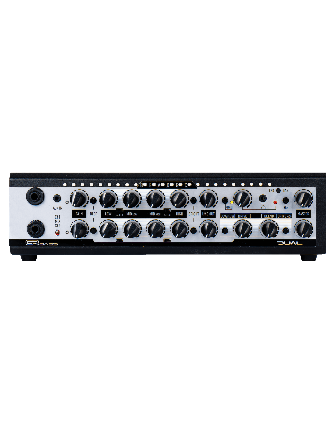 DUAL800 GR ONE / DUAL Calidad y potencia. Ecualizador de 4 bandas. 6 Frecuencias seleccionables para los medios y los filtrosprofundos y brillantes te permitirán añadir pegada y/o definicióna la ecualización. Interruptor de SONIDO PURO. Medidor de 24 LED