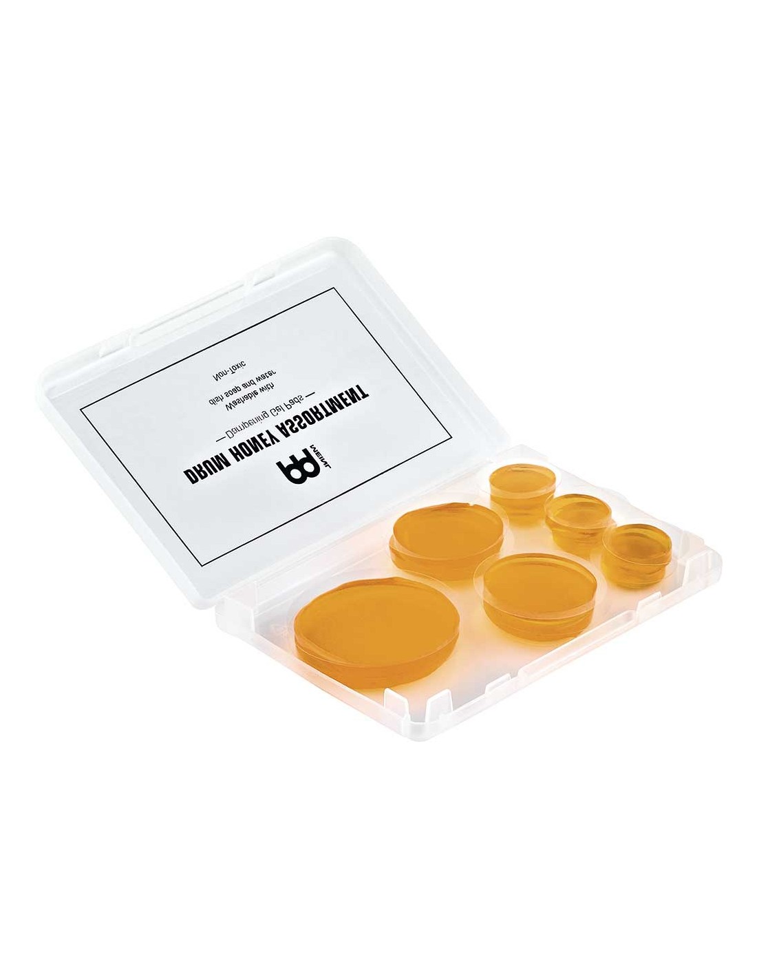 ACCESORIO PLATOS 'Selección de apagadores de armónicos ''Drum Honey'' en diferentes medidas para aplicar en diferentes elementos de nuestro set. El set lo forman 12 piezas: 6 pequeñas, 4 medianas y 2 grandes. Inclye estuche para perfecta conservación.'