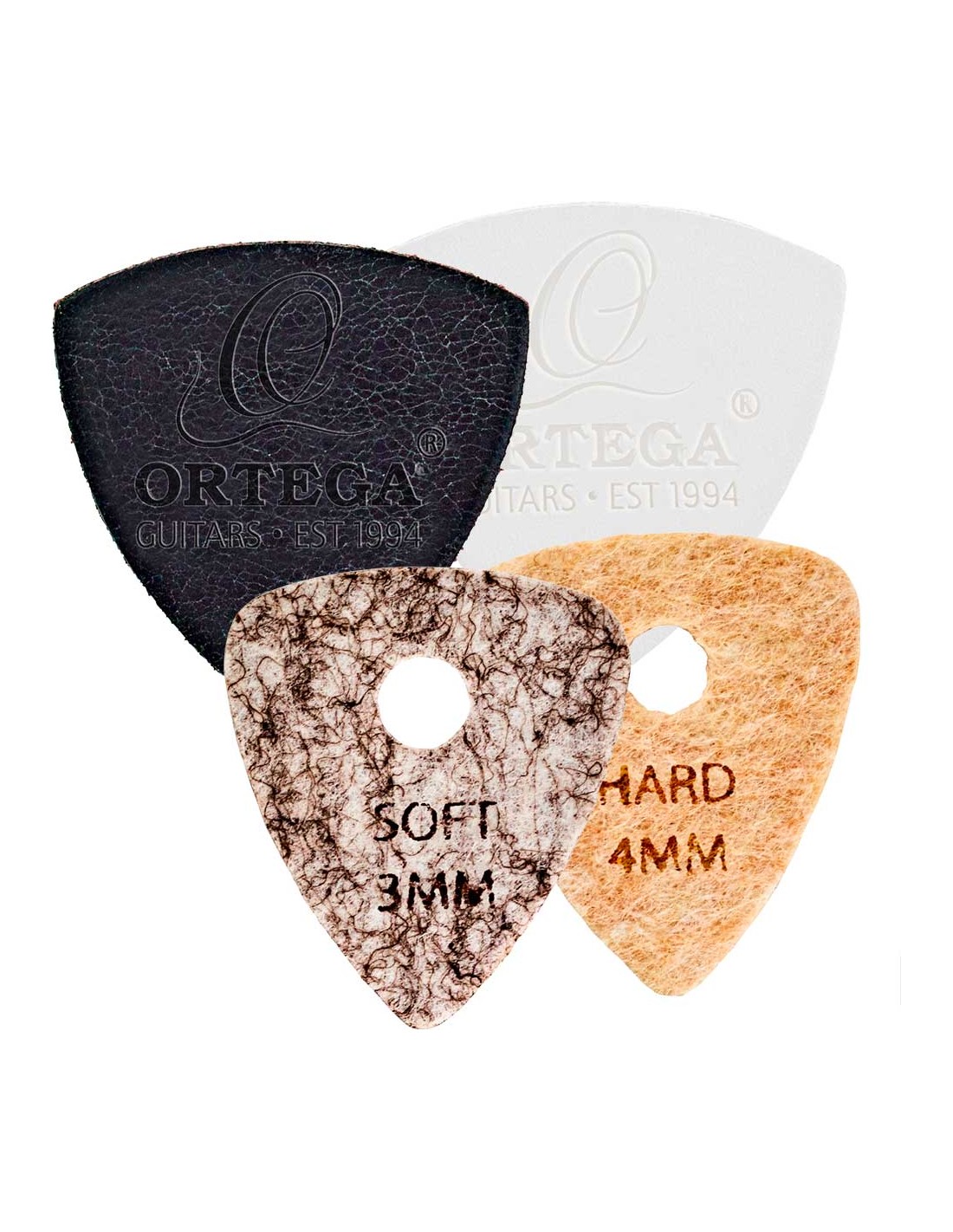 OGP-VP1 Pack de puas especiales para instrumentos acústicos (guitarra clásica, ukelele, bajo acústico…etc). Incluye 2 puas de piel (negra y blanca) y 2 puas de fieltro (una con grosor fino y otra con grosor duro).