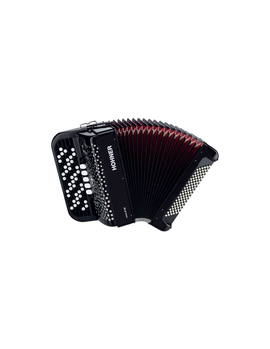 ACORDEON DE BOTONES CROMATICO Acordeón cromático con 72 botones en 5 filas, 3 voces en el teclado, 96 bajos con 4 voces/ 3 registros, peso 7,6 Kg. Funda blanda y correas.
