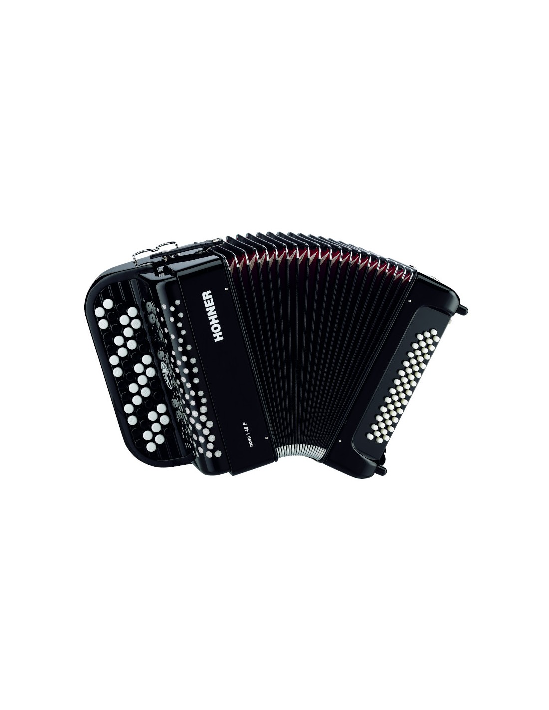 ACORDEON DE BOTONES CROMATICO Acordeón cromática con bajo libre (cromático). 37 notas (SOL-SOL), 48 botones en 4 filas, 1 voz. Bajos: 49 botones, 37 notas (cromáticos, SOL-SOL), 1 voz. Peso, 4,4 kg. Incluye correas y funda de transporte.