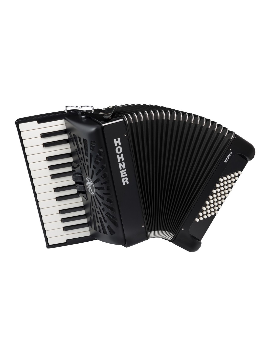 ACORDEON DE PIANO CROMATICO Nuevo modelo 2019. Fuelle en color negro, teclado con sistema SILENTKEY, mecanismo de bajos optimizado, nuevos botones de registro, funda mejorada con asas ergonómicas. 48 bajos, peso 5,1 Kg, 2 registros en el teclado de 26 teclas, 2 voces, correa y funda incluídas. Color negro.