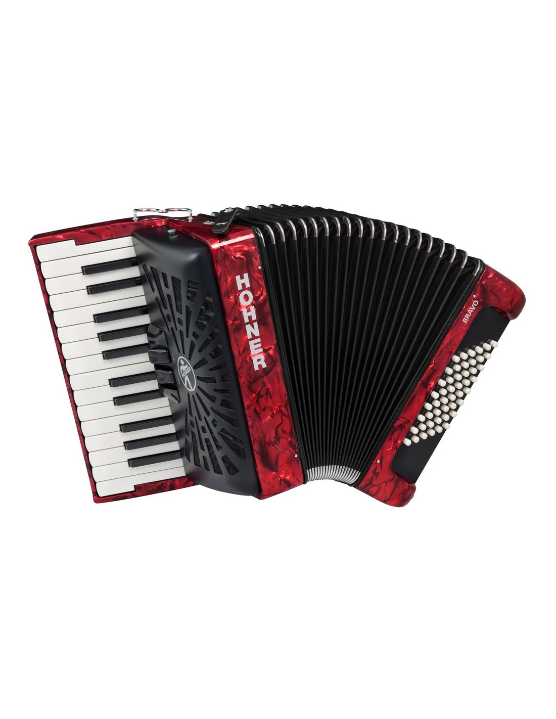 ACORDEON DE PIANO CROMATICO Nuevo modelo 2019. Fuelle en color negro, teclado con sistema SILENTKEY, mecanismo de bajos optimizado, nuevos botones de registro, funda mejorada con asas ergonómicas. 48 bajos, peso 5,1 Kg, 2 registros en el teclado de 26 teclas, 2 voces, correa y funda incluídas. Color rojo.