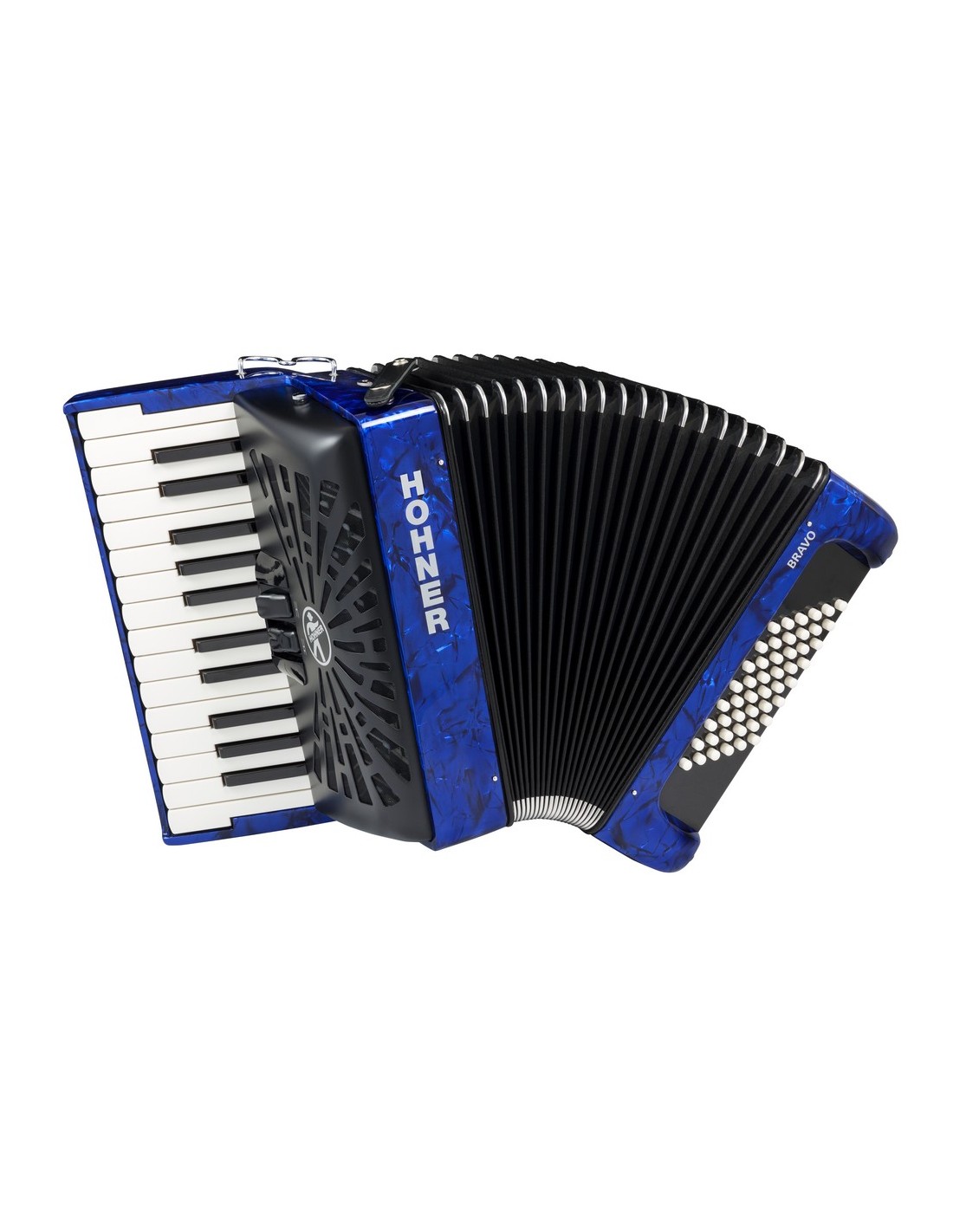 ACORDEON DE PIANO CROMATICO Nuevo modelo 2019. Fuelle en color negro, teclado con sistema SILENTKEY, mecanismo de bajos optimizado, nuevos botones de registro, funda mejorada con asas ergonómicas. 48 bajos, peso 5,1 Kg, 2 registros en el teclado de 26 teclas, 2 voces, correa y funda incluídas. Color azul.
