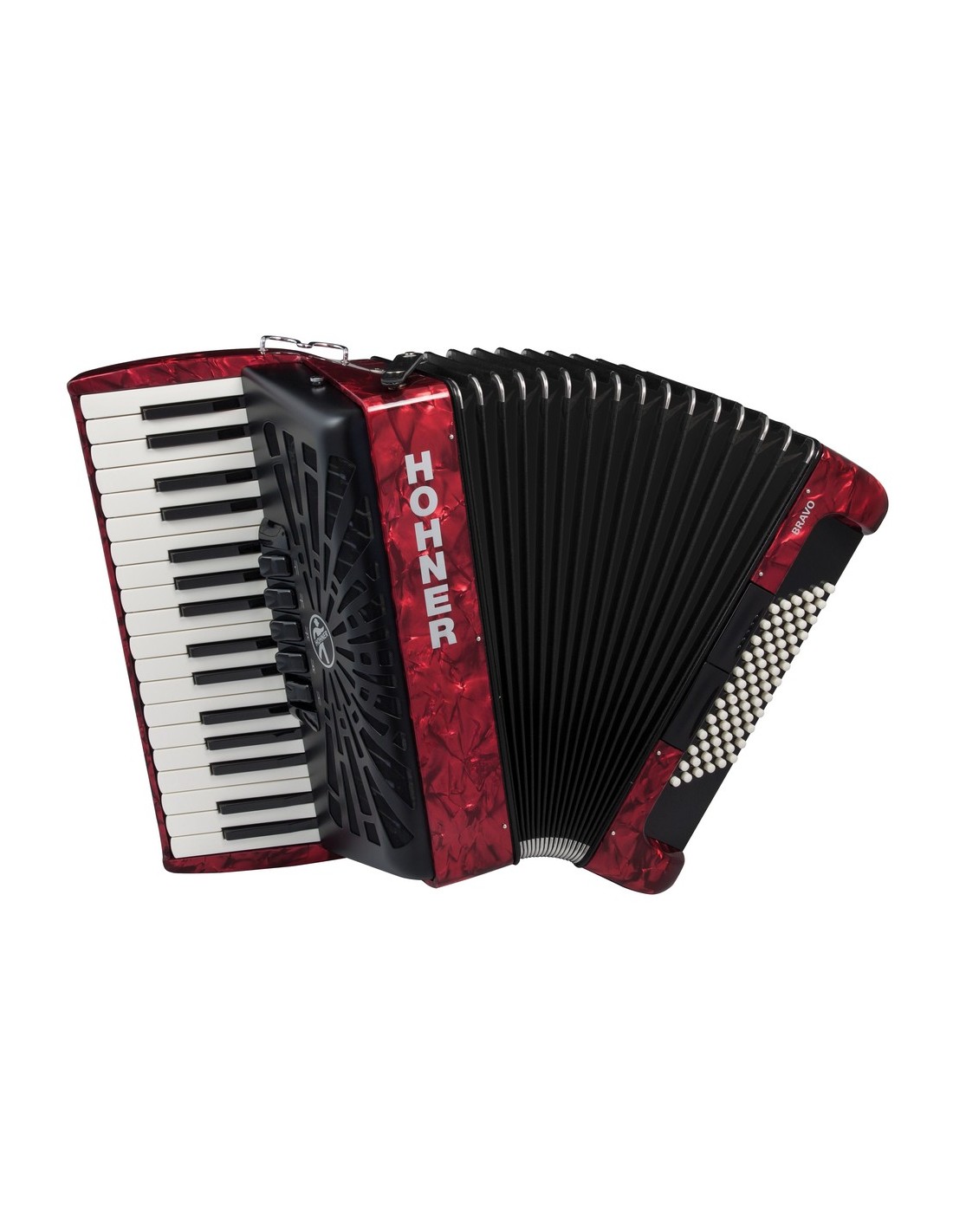 ACORDEON DE PIANO CROMATICO Nuevo modelo 2019. Fuelle en color negro, teclado con sistema SILENTKEY, mecanismo de bajos optimizado, nuevos botones de registro, funda mejorada con asas ergonómicas. 72 bajos, peso 7,4 Kg, 7 registros en el teclado de 34 teclas, 3 registros en los bajos, 4 voces, correa y funda incluídas. Color rojo.
