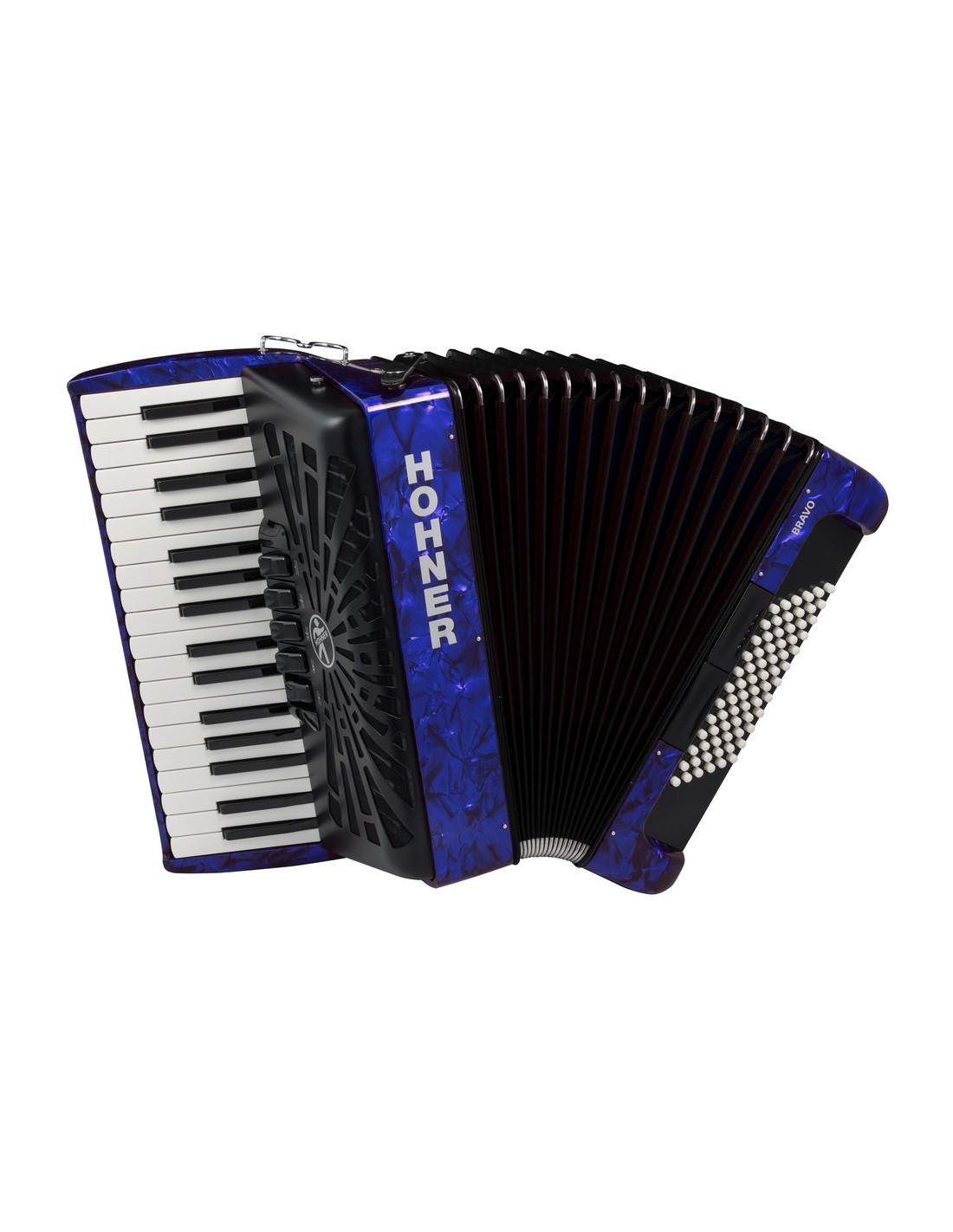 ACORDEON DE PIANO CROMATICO Nuevo modelo 2019. Fuelle en color negro, teclado con sistema SILENTKEY, mecanismo de bajos optimizado, nuevos botones de registro, funda mejorada con asas ergonómicas. 72 bajos, peso 7,4 Kg, 7 registros en el teclado de 34 teclas, 3 registros en los bajos, 4 voces, correa y funda incluídas. Color azul.