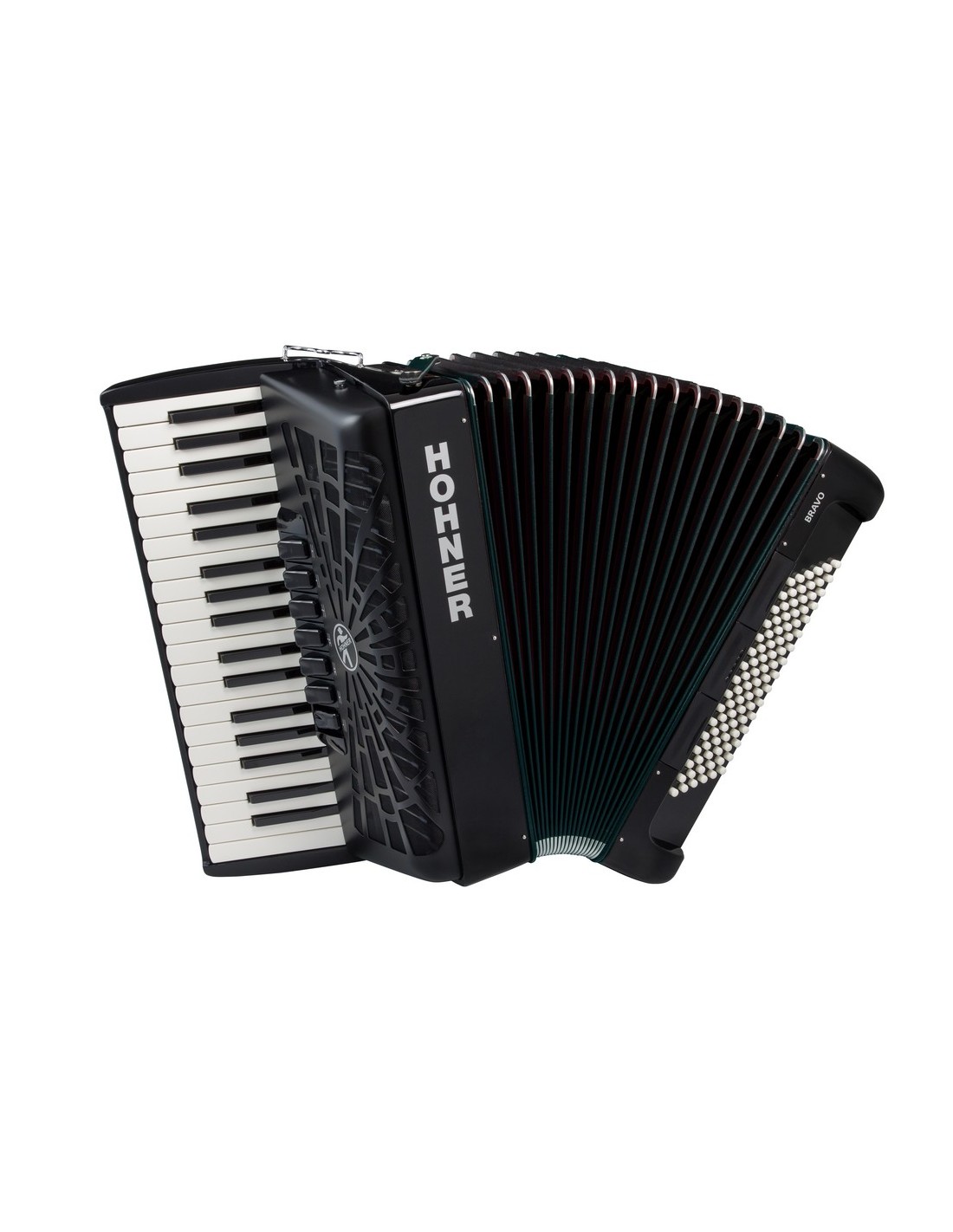 ACORDEON DE PIANO CROMATICO Nuevo modelo 2019. Fuelle en color negro, teclado con sistema SILENTKEY, mecanismo de bajos optimizado, nuevos botones de registro, funda mejorada con asas ergonómicas. 96 bajos, peso 8,6 Kg, 7 registros en el teclado de 37 teclas, 3 registros en los bajos, 4 voces, correa y funda incluídas. Color negro.