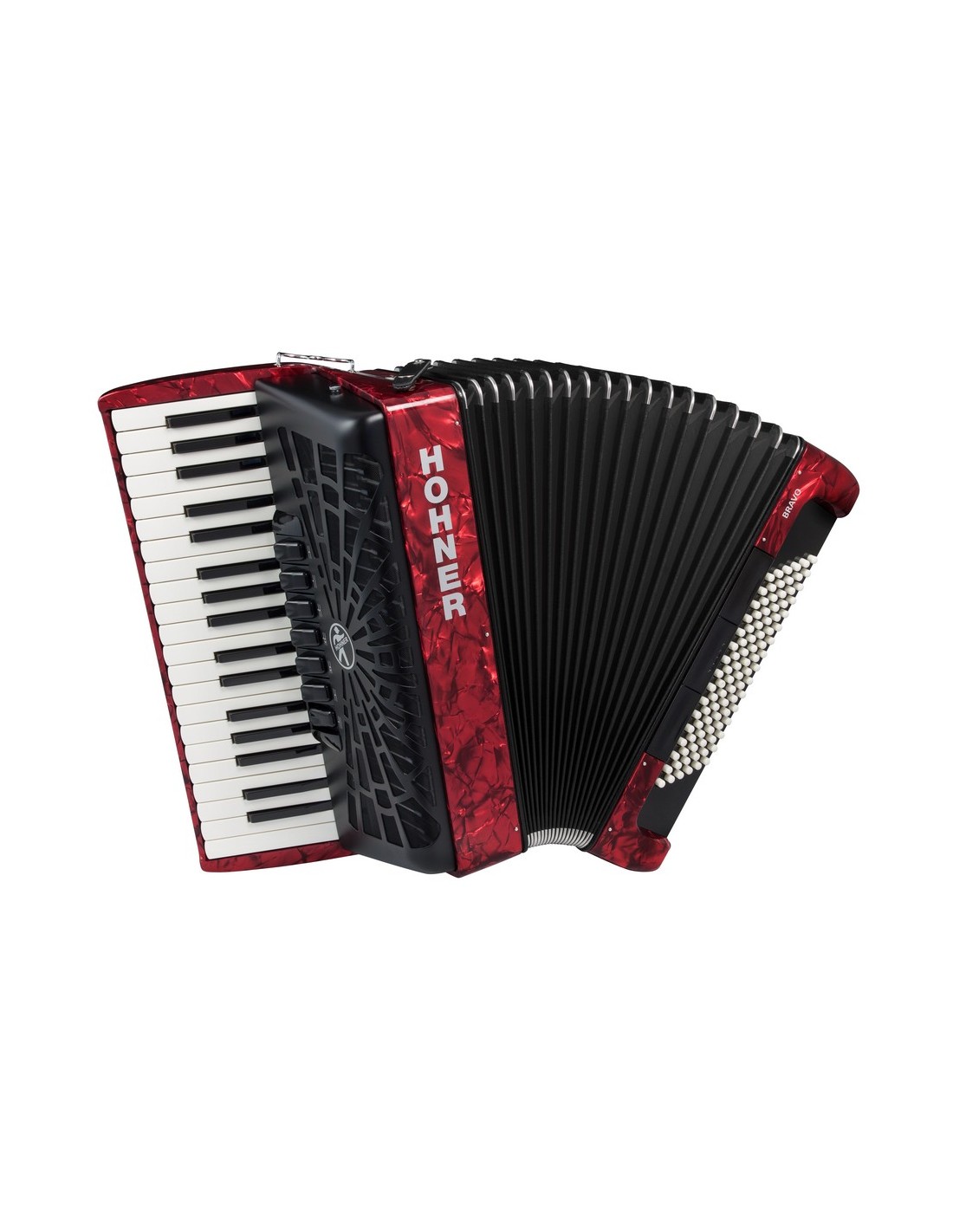 ACORDEON DE PIANO CROMATICO Nuevo modelo 2019. Fuelle en color negro, teclado con sistema SILENTKEY, mecanismo de bajos optimizado, nuevos botones de registro, funda mejorada con asas ergonómicas. 96 bajos, peso 8,6 Kg, 7 registros en el teclado de 37 teclas, 3 registros en los bajos, 4 voces, correa y funda incluídas. Color rojo.