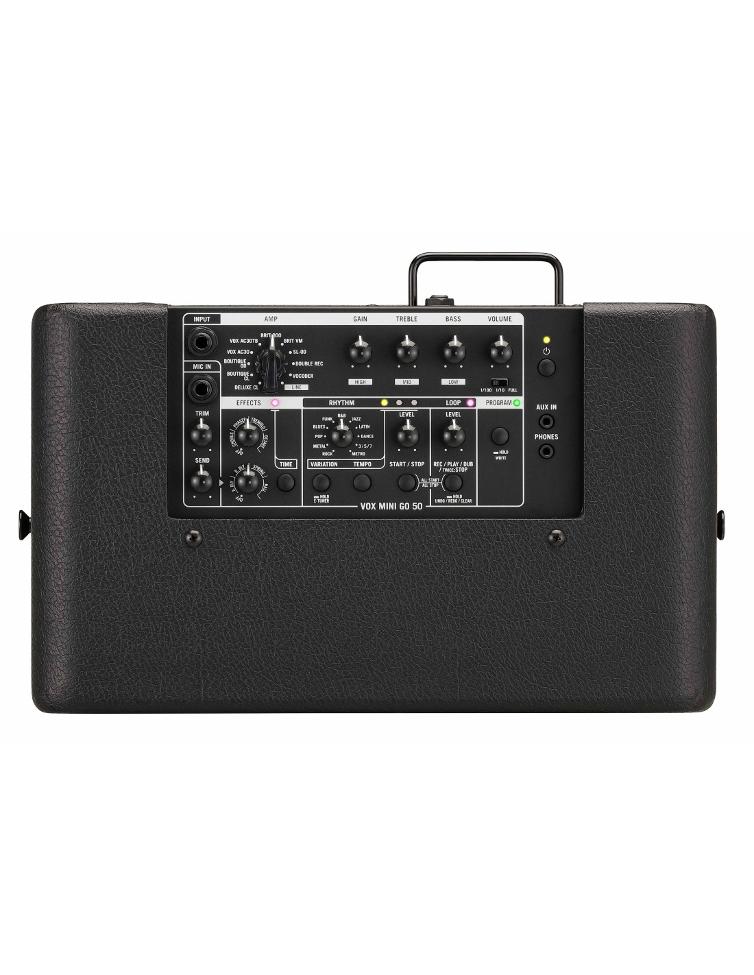 AMPLIFICADOR COMBO PARA GUITARRA El VOX MINI GO es un amplificador de modelado de guitarra portátil que cubre todas las necesidades, desde la práctica hasta la actuación en directo, en casa, en salas de conciertos o al aire libre. Ligero, portátil y alimentado por una batería móvil. Ofrece modelos de amplificadores potentes y realistas basados en los que ofrece el Cambridge50, así como un vocoder de reciente desarrollo para efectos de modulación de voz, efectos integrados que te permiten crear una amplia gama de sonidos, una entrada de micrófono, entrada AUX, una toma de auriculares y una unidad de ritmo que puede reproducir patrones de distintos géneros. Con looper integrado. Con un altavoz de 8 pulgadas de 50w de potencia con salida ajustable. Potencia seleccionable. Cambia entre tres etapas: FULL, 1/10 o 1/100. Incluye un looper, que se puede utilizar junto con los efectos y la unidad de ritmo para agregar variación a la interpretación. Los ajustes de amplificador y efecto en este modelo son programables. Este modelo es la mejor opción para la interpretación en vivo o cuando toques junto con el looper. Compatible con el footswitch VFS3 para controlar varias características, como los ritmos, efectos, looper y programas. Con sistema de inclinación. Batería portátil recomendada con una potencia de 1,5 A o superior. Adaptador de corriente (19v) incluido. Dimensiones: 390 x 250 x 358 mm. Peso: 7.3 Kg.