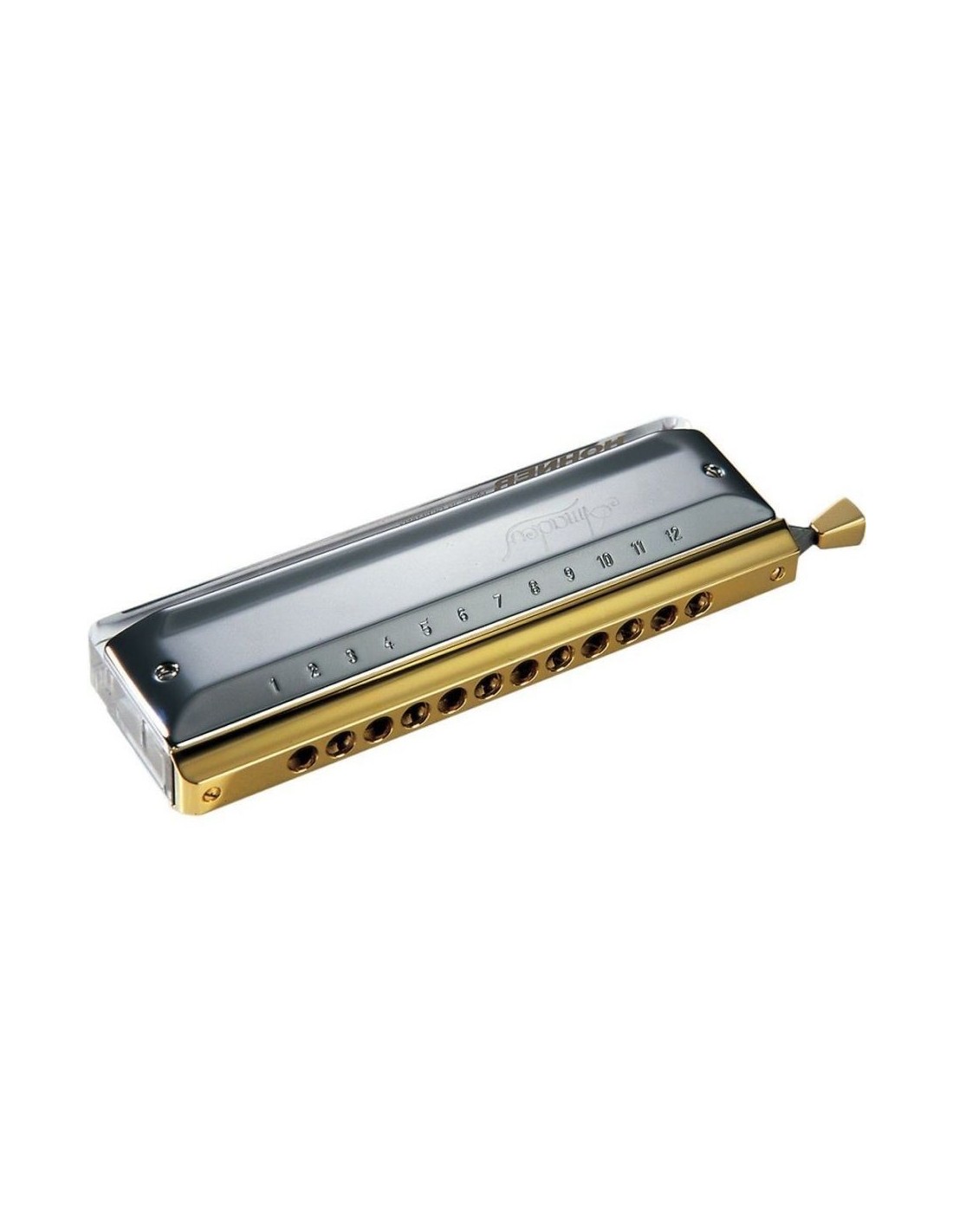 ARMÓNICA CROMÁTICA Material de máxima calidad incluyendo el peine acrylico cortado con máquina de control númerico. Embocadura ergonómicamente diseñada en lacado doradoy ajustado con la máxima precisión. Mecanismo perfecto y por supuesto lengüetas fabricados por las manos más expertas distinguen a este modelo de armónica de lujo. Fabricaña en Alemania. 48 voces.
