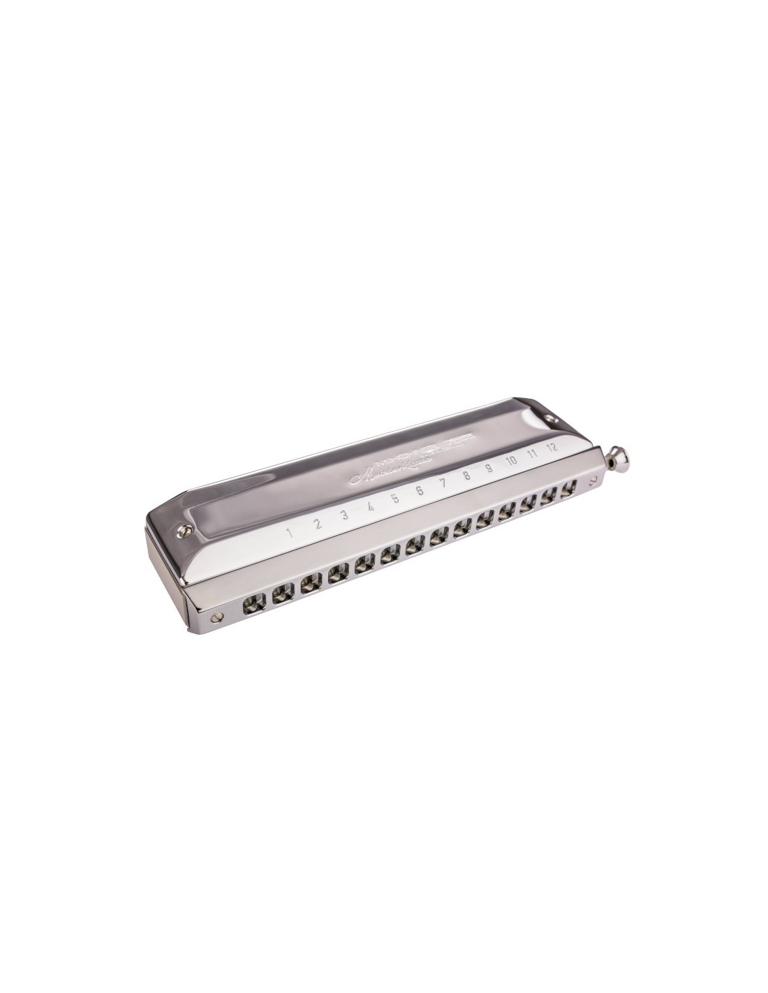 ARMÓNICA CROMÁTICA La Meisterklasse es nuestro única cromática de 14 agujeros, con una escala que se extiende hacia abajo hasta Sol 3, dándole el mismo rango tonal que un violín y haciendo posible que el intérprete domine piezas clásicas escritas para ese instrumento. Al igual que su homónima diatónica, la Meisterklasse cromática cuenta con un peine de aluminio anodizado y está equipada con cubiertas de latón cromado especialmente diseñadas para una proyección de sonido óptima. Aunque originalmente concebida para la música clásica, su tono brillante y su respuesta rápida y potente aseguran que también sea una favorita para el Pop, el Rock y el Jazz.