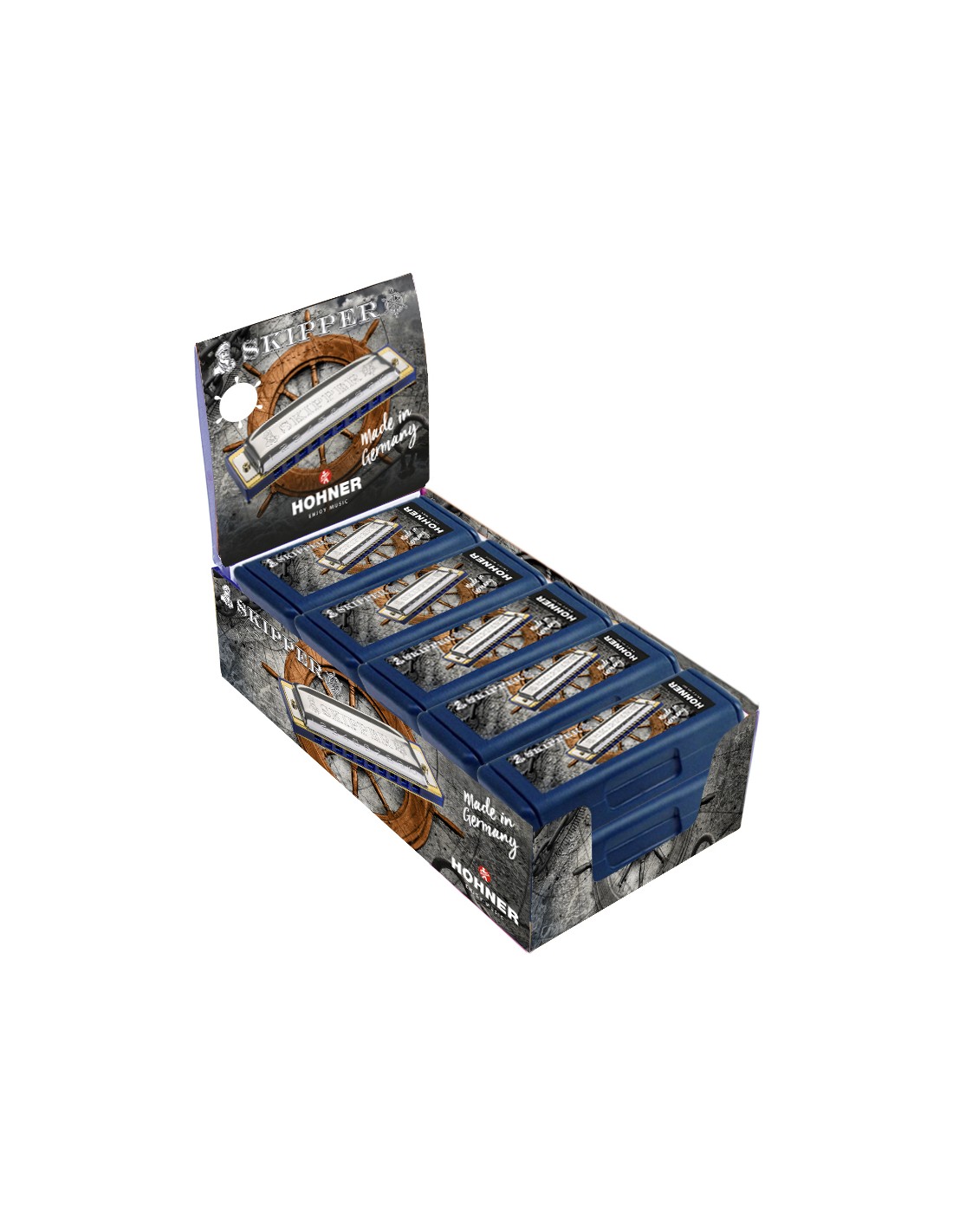 ARMÓNICA DIATÓNICA Serie MS. La Skipper es la compañera ideal para las canciones marineras o los blues lentos. Con esta armónica obtendrás el auténtico sonido Hohner en cualquier sitio, a cualquier hora. Armónica diatónica serie MS. Pack de 20 unidades con expositor para el mostrador. Robusto peine en plástico resistente la humedad. Afinación en Do. El recuerdo perfecto para las vacaciones junto al mar.
