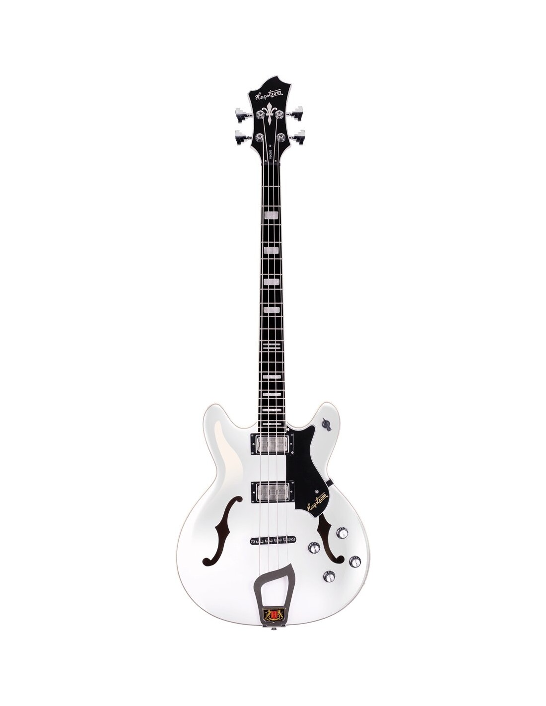 BAJO DE 4 CUERDAS 'Viking Bass - White Gloss, Contoured Ply-Maple Semi-Hollow body, Maple Set-Neck, Long throw T-O-M Bridge, Hagstrom Trapeeze, 2 x Hagstrom Dyna Rail Alnico 5, Mesh Covered Pickups, 2 x Vol, 2 x Tone, 6-Way Rotary Pickup Selector, Scale Length 30.75'', H-Expander Truss Rod, 22:1 Hagstrom Tuners, Resinator Fretboard'