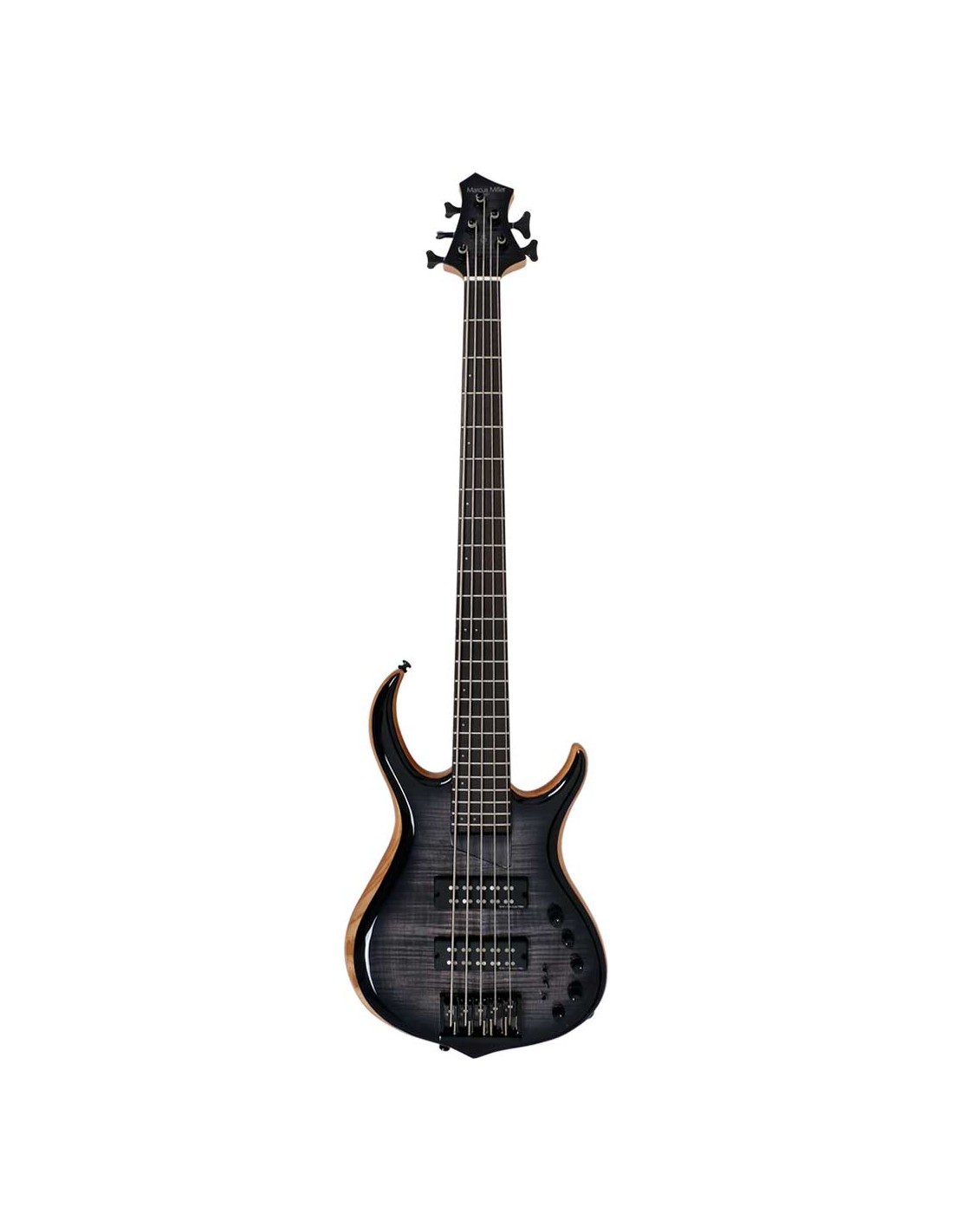 BAJO DE 5 CUERDAS Marcus Miller Bass. 2nd Gen. 5 cuerdas. Cuerpo : Fresno con tapa maciza de arce. Forma : New Modern Bass. Mástil : Arce canadiense(Scarf Joint). Forma : C-Shape. Escala : 35” (for clear low B). Unión del mástil : 5 Bolt Individual Dot. Diapasón(Rolled Edges) : Ébano. Radio diapasón : 12”. Trastes : Medium, 24 Trastes. Cejuela : 5 String – Natural Bone 45mm width. Incrustaciones : White Pearl Dot. Pastillas : Marcus Pure-H Revolution Set. Electrónica : Marcus Miller Heritage-3 with Middle Frequency Control. Potenciómetros : Modern Black Plastic. Puente : Marcus Miller Heavy Mass Custom. Clavijeros : Sire Diecasting Gear. Herrajes : Black. Pickguard : None. Acabado Trans black.