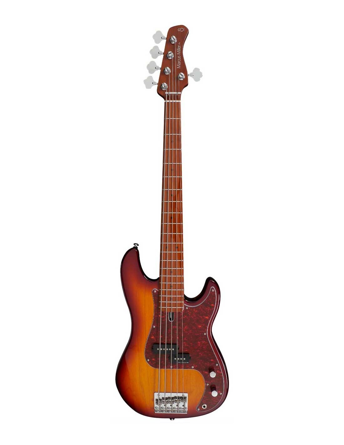 BAJO DE 5 CUERDAS Marcus Miller Bass. 5 cuerdas. Cuerpo: Aliso americano. Forma : Sire Precision Bass Type. Mástil: 1 Piece Arce tostado. Forma: C-Shape. Escala: 34''. Diapasón Material: Arce tostado (Rolled Edges). Radio diapasón: 9.5''. Trastes: 2.4mm Medium. Cejuela: Bone Nut, 5strings-47.6mm Width. Binding: None. Incrustaciones: BK Dot. Unión del mástil: 4-Bolt Steel Square Plate. Pastillas: Marcus Vintage-Precision Revolution Set. Electrónica: Passive Volume & Tone Control. Controles: Volume, Tone. Potenciómetros: Chrome Metal Knob. Puente: Marcus Miller Vintage-S. Clavijeros: Premium Open-Gear. Herrajes: Chrome. Golpeador: Tortoise. Acabado Tobacco Sunburst.