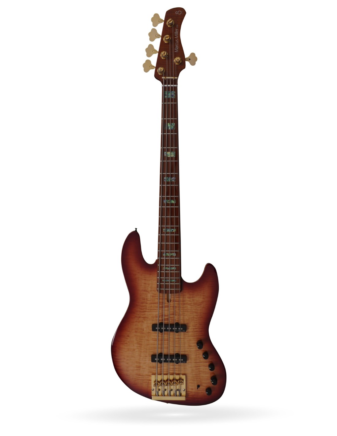 Cuerpo : Fresno (swamp ash) con tapa maciza de arce flameado. Forma : New Marcus Miller Jazz Type. Mástil de arce tostado (satinado). Forma: C-Shape. Escala: 34''. Unión del mástil: atornillado (Bolt-On). Diapasón (Rolled Edges): arce tostado. Radio diapasón: 9.5''. Trastes: 2.4 medium. Cejuela: 5 cuerdas, hueso, 46mm anchura. Incrustaciones : bloques de abalone. Pastillas: Marcus Premium-J Revolution Set. Electrónica: Marcus Heritage-3 con Middle Frequency Control. Controles: Volume / Tone (Dual Pot) Pickup Blender Treble Middle / Middle Frequency (Dual Pot) Bass, Mini Toggle (Active / Passive). Potenciómetros: en aluminio negro. Puente: Hipshot Kickass. Clavijeros: Hipshot USA Ultralite. Herrajes: dorados. Golpeador: incluye golpeador transparente. Incluye estuche. Acabado: Tobacco Sunburst.