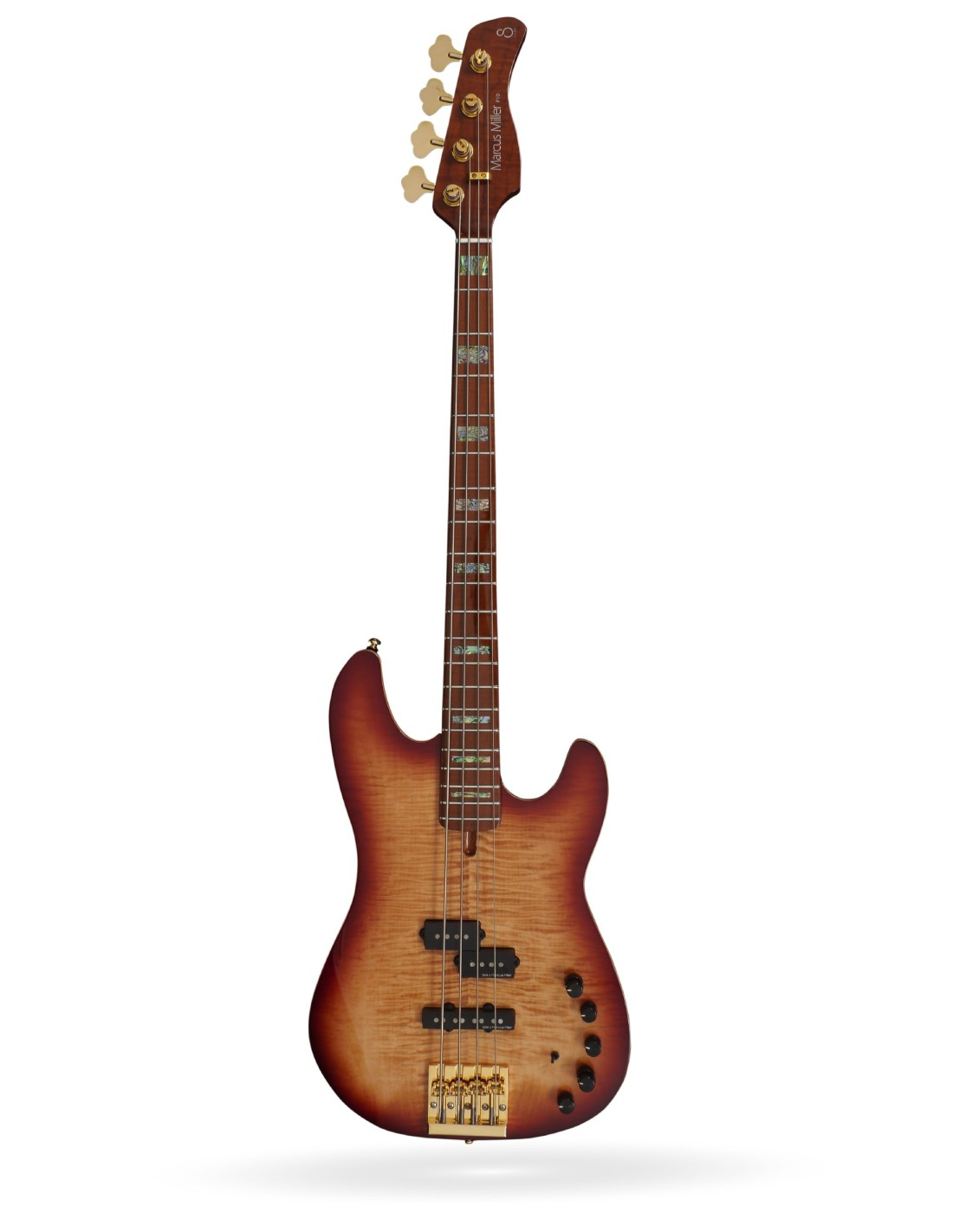 Cuerpo : Fresno (swamp ash) con tapa maciza de arce flameado. Forma : New Marcus Miller P-Bass Type. Mástil de arce tostado (satinado). Forma: C-Shape. Escala: 34''. Unión del mástil: atornillado (Bolt-On). Diapasón (Rolled Edges): arce tostado. Radio diapasón: 9.5''. Trastes: 2.4 medium. Cejuela: 4 cuerdas, hueso, 38mm anchura. Incrustaciones : bloques de abalone. Pastillas: Marcus PJ Revolution Set. Electrónica: Marcus Heritage-3 con Middle Frequency Control. Controles: Volume / Tone (Dual Pot) Pickup Blender Treble Middle / Middle Frequency (Dual Pot) Bass, Mini Toggle (Active / Passive). Potenciómetros: en aluminio negro. Puente: Hipshot Kickass. Clavijeros: Hipshot USA Ultralite. Herrajes: dorados. Golpeador: incluye golpeador transparente. Incluye estuche. Acabado: Tobacco Sunburst.