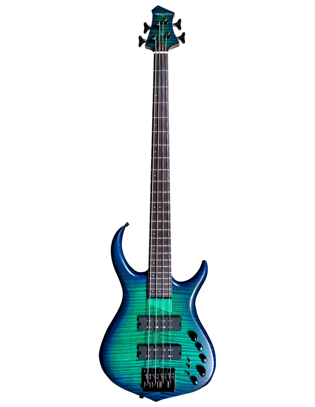 BAJO SIN TRASTES Marcus Miller Bass. 2nd Gen. Fretless (sin trastes). Cuerpo : Alder with Solid top Arce Wood. Forma : New Modern Bass. Mástil : Arce canadiense (Scarf Joint). Forma : C-Shape. Escala : 34''. Unión del mástil : 4 Bolt Individual Dot. Diapasón(Rolled Edges) : Ébano. Radio diapasón : 12”. Cejuela : 4 String – Natural Bone 38mm width. Incrustaciones : White Pearl Dot. Pastillas : Marcus Pure-H Revolution Set. Electrónica : Marcus Miller Heritage-3 with Middle Frequency Control. Potenciómetros : Modern Black Plastic. Puente : Marcus Miller Heavy Mass Custom. Clavijeros : Sire Diecasting Gear. Herrajes : Black. Acabado Trans Blue.