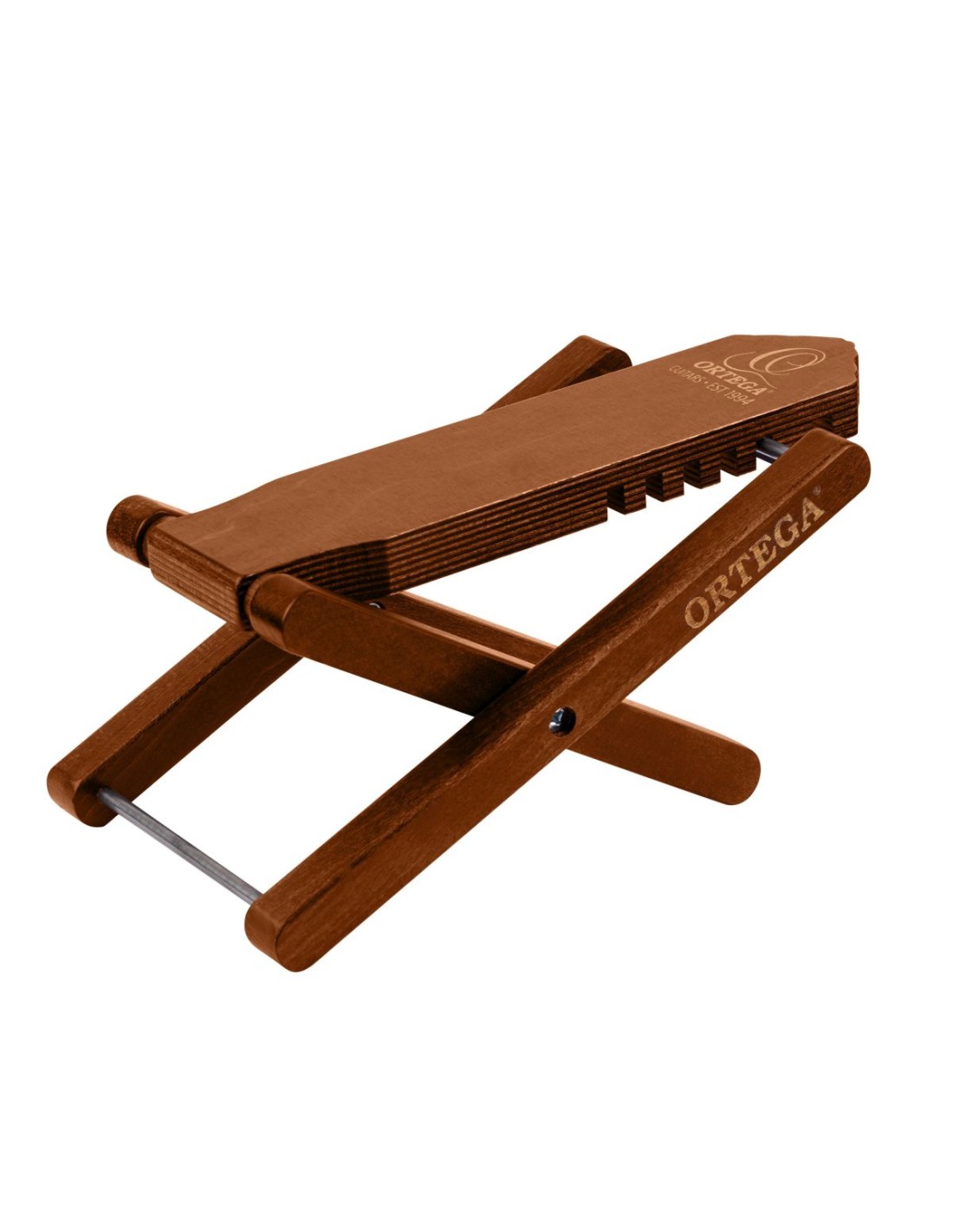 BANQUETA APOYAPIE PARA GUITARRISTA Taburete de madera con forma de cabezal Ortega, acabado marrón oscuro