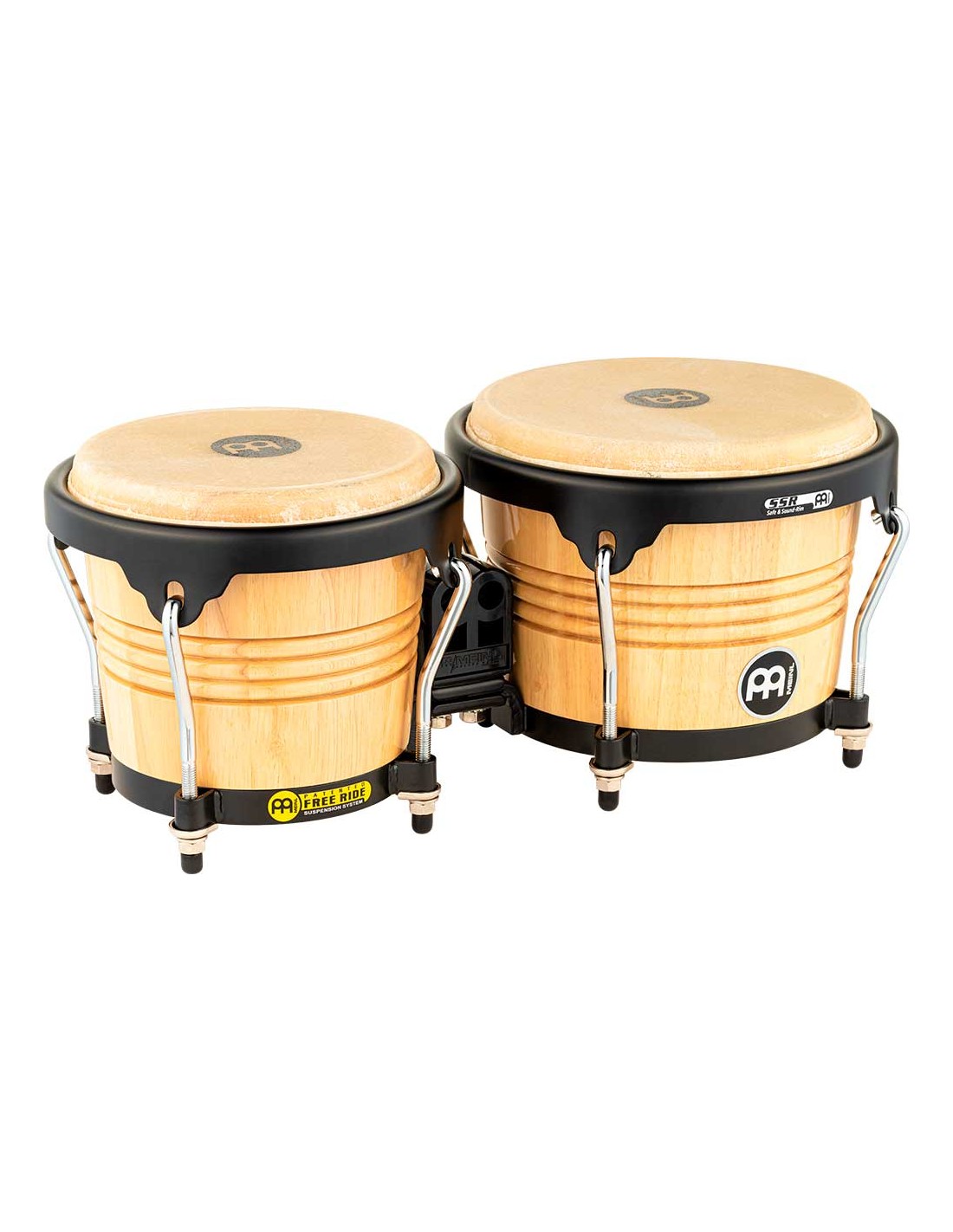BONGOS 'Set de bongós en madera (6'' 3/4 y 8''). Un excelente bongo con el innovador sistema Free Ride que no perfora los cascos aumentado así la resonancia y volumen. El cuerpo es de madera de caucho y los parches de piel de búfalo seleccionada a mano. Además montan una pieza central patentada y de plástico que permite una sujeción total al pie de bongó si re requiriese.