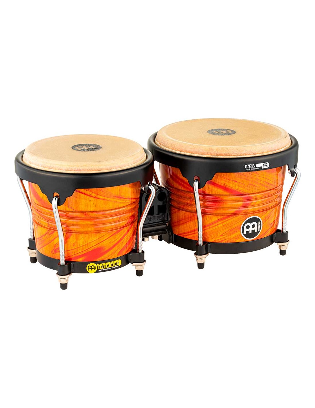 BONGOS 'Set de bongós acabado Amber Flame (6'' 3/4 y 8''). Un excelente bongo con el innovador sistema Free Ride que no perfora los cascos aumentado así la resonancia y volumen. El cuerpo es de madera de caucho y los parches de piel de búfalo seleccionada a mano. Además montan una pieza central patentada y de plástico que permite una sujeción total al pie de bongó si re requiriese.