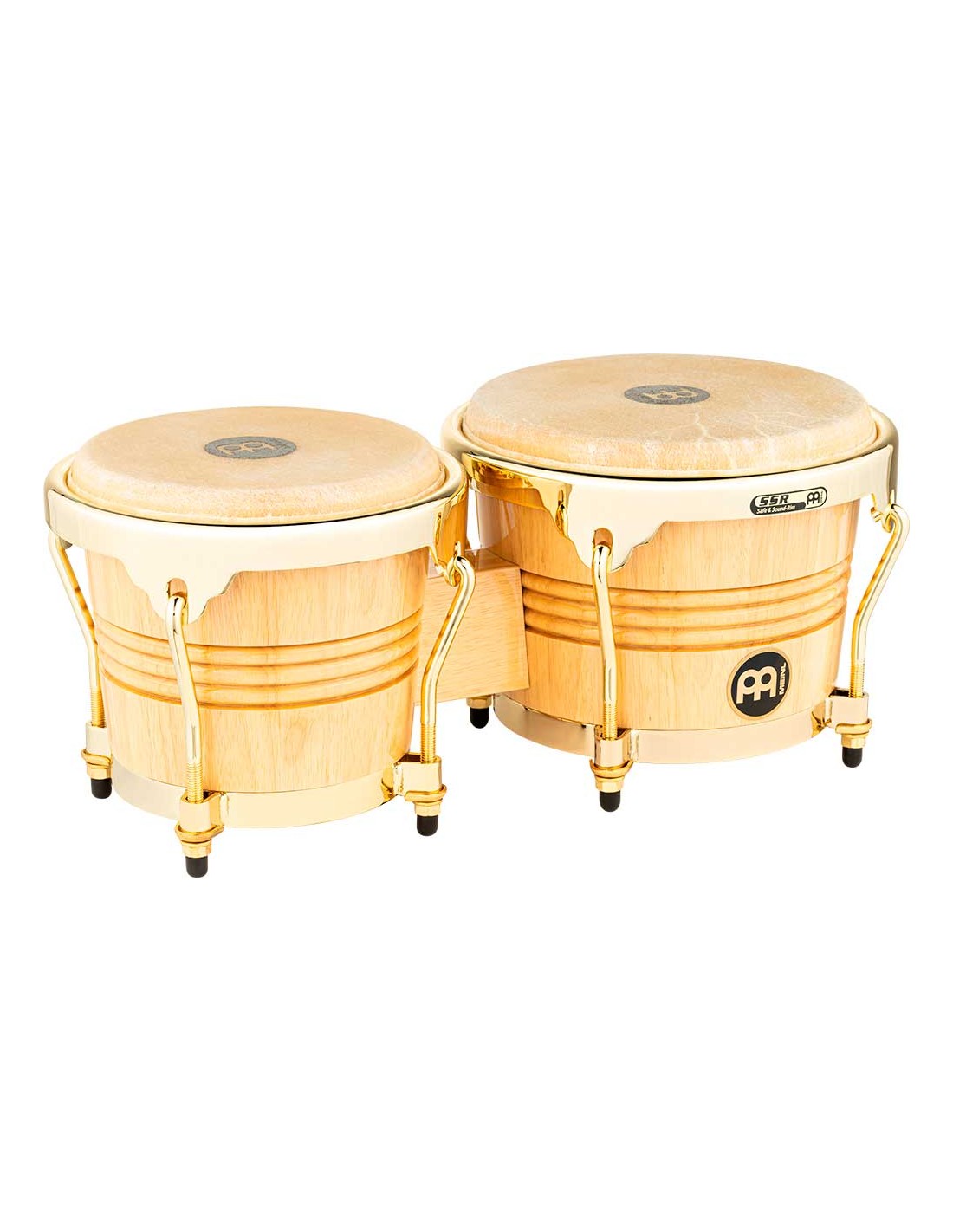 BONGOS 'Set de bongós serie Wood (6 3/4 y 8''). Este bongó ha sido diseñado respetando las caracterísiticas de los bongos tradicionales de Cuba. El cuerpo es de madera roble de Siam y los parches de piel de búfalo seleccionada a mano. La mejora que se ha añadido han sido los aros SSR redondeados y dorados que hacen la práctica mucho más cómoda.
