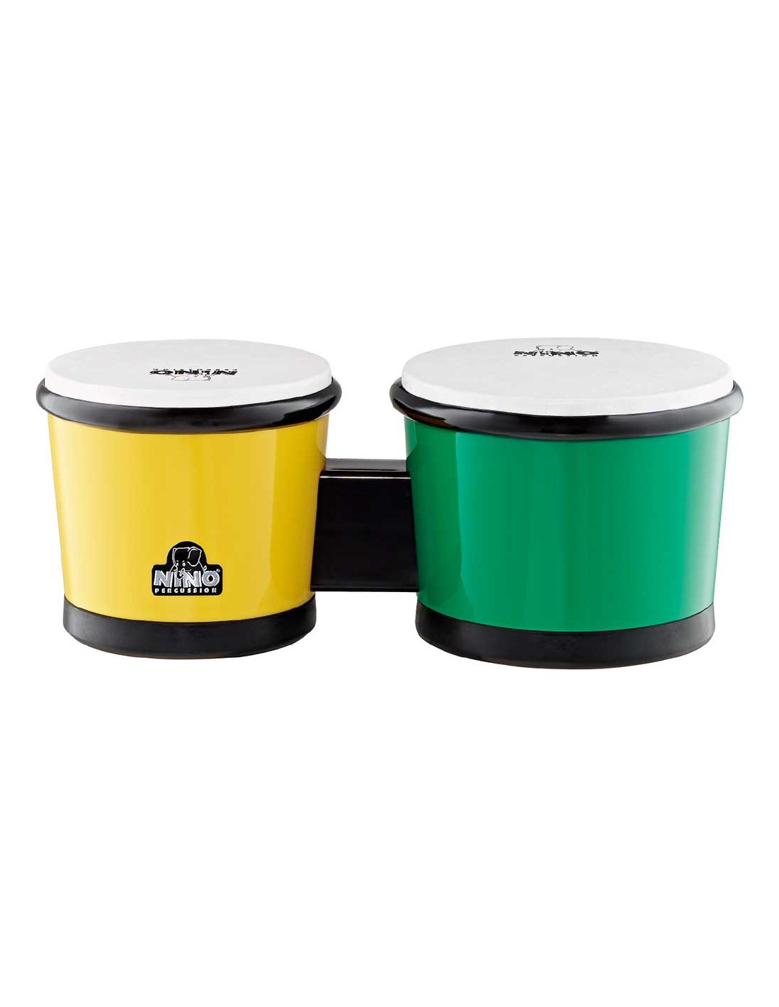 BONGOS Los Tambores ABS NINO ® no sólo tienen un colorido duradero, sino que también tienen un potente sonido. Los cajas de plástico ABS y los parches sintéticos les garantizan una gran estabilidad y una larga vida. Además con un peso ligero, de cerca de dos libras, y hechos a mano de manera excepcional, los Tambores ABS NINO ® son perfectamente adecuados para niños. Los Djembres multicolor de NINO® ABS vienen presintonizados y listos para tocar nada más sacarlos de la caja.