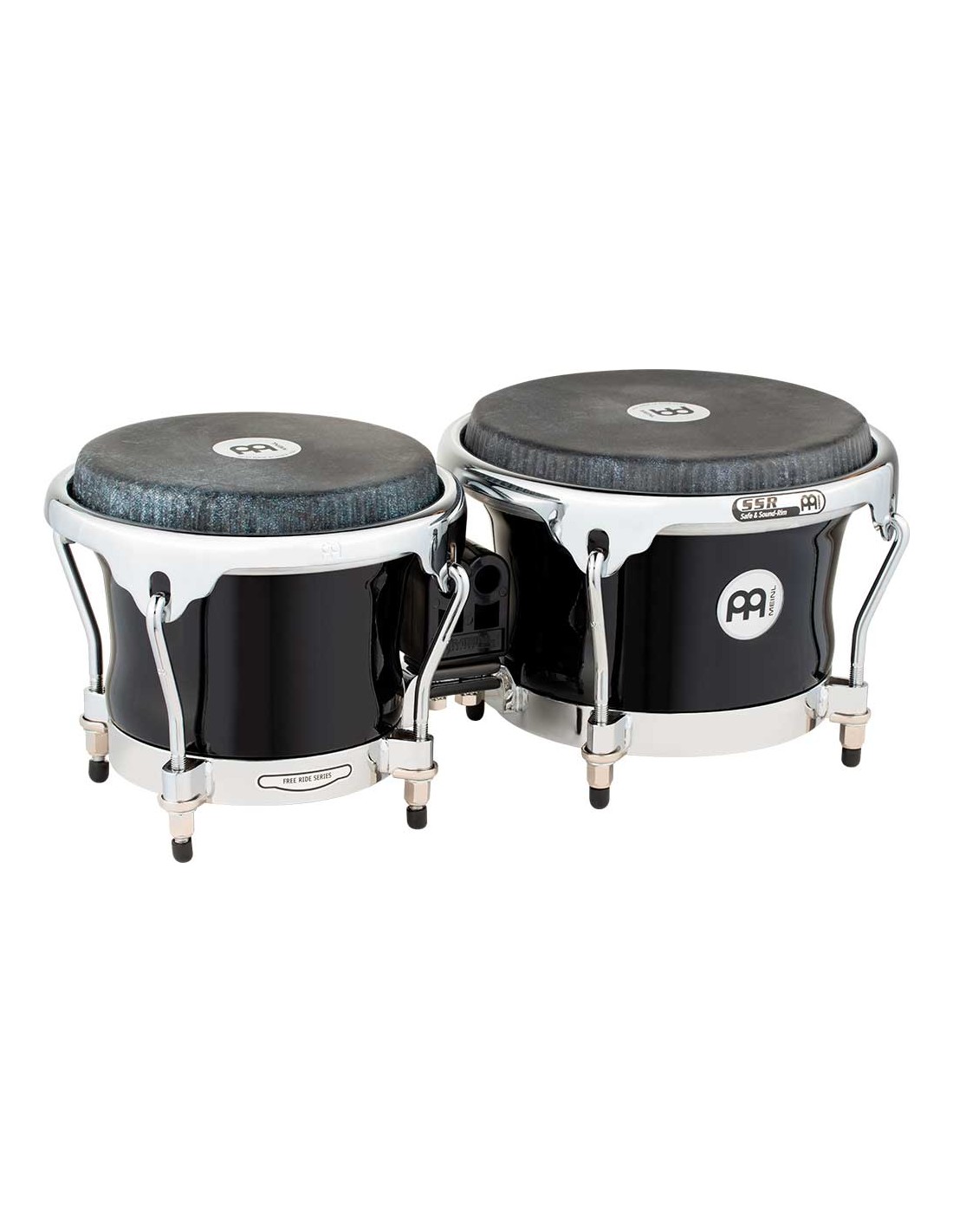 BONGOS 'Set de bongos de fibra (7 y 8 1/2'') negros. Un excelente bongo con el innovador sistema Free Ride que no perfora los cascos aumentado así la resonancia y volumen. El cuerpo es de fibra de vídrio y los parches son unos Skyndeep hechos por Remo y acabados en negro. Además montan una pieza central patentada y de plástico que permite una sujeción total al pie de bongó si se requiriese.