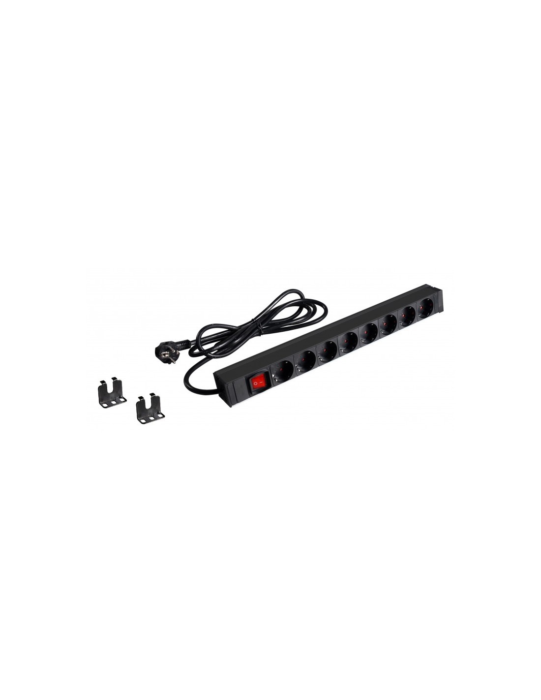 CABLE DE CORRIENTE Barra de alimentación horizontal de 1U fabricada en perfil de aluminio y piezas termoplásticas ignífugas. Toma de corriente schuko con interruptor de iluminación rojo. Cable de 2,5 metros de longitud. Capacidad para 8 enchufes de 16A 230V 2P+G. Equipado con aletas metálicas universales, para montaje en armarios rack de 19'.