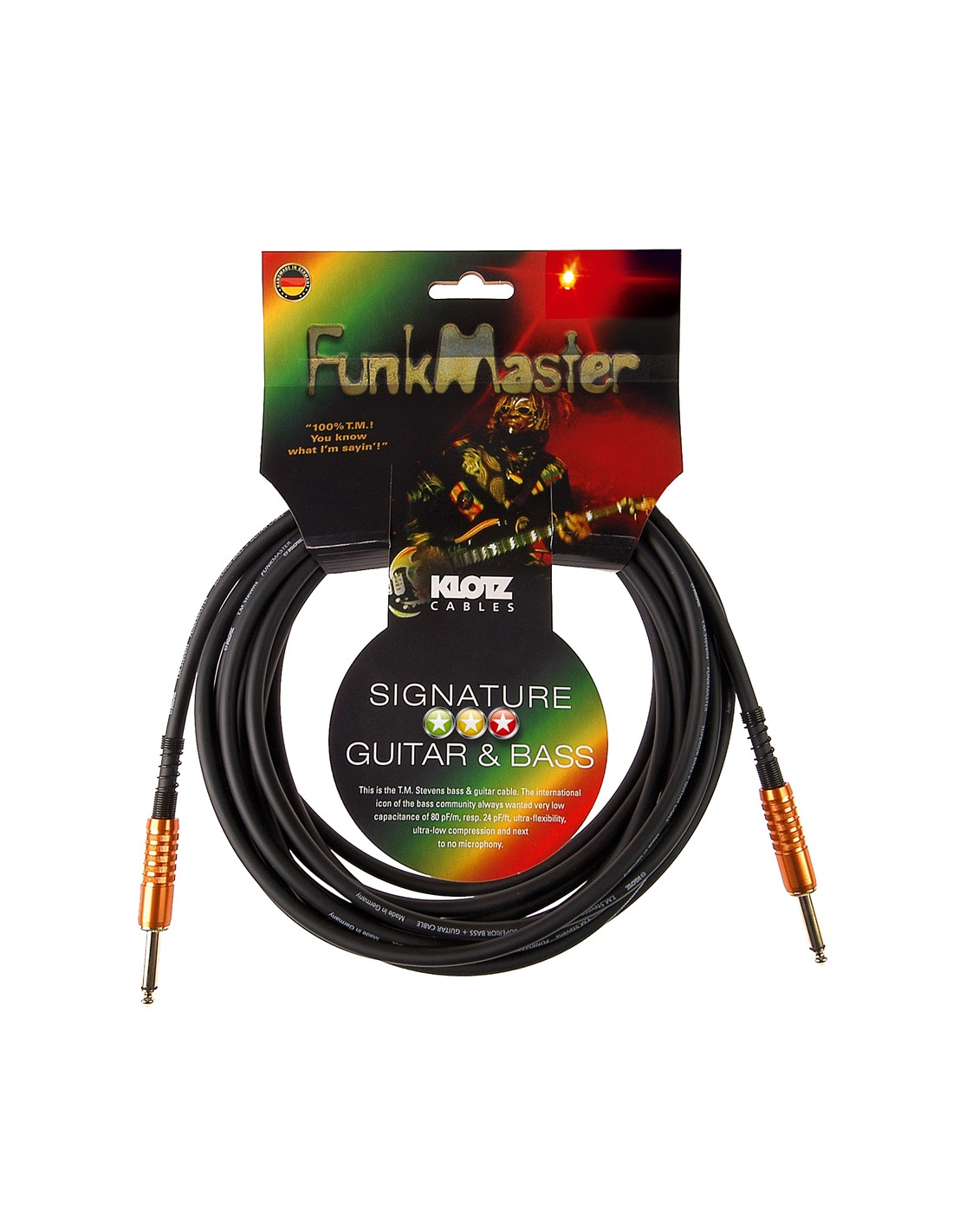CABLE DE INSTRUMENTO Cable de instrumento recomendado para bajo- Diseñado con el funkmaster T.M. Stevens- Núcleo de cobre- Cubierta de PVC ultradenso con doble espiral de cobre- Conexión jack Klotz de 6,35mm- Capuchon de aluminio anodizado- Gran transparencia, compresión ultra grave- Jack recto/recto- Longitud 3 metros
