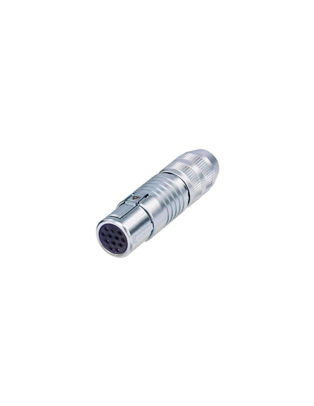 Conector aéreo hembra de 12 pines, con sistema prensacable exclusivo y contactos para soldar. Serie: miniCON. Color níquel, contactos en oro. El diseño del miniCON es flexible, compacto e ideal para aplicaciones multipin e industriales. Conector fabricado completamente en metal. Especificaciones mecánicas: contactos de soldadura, sistema de bloqueo push-pull. Calibre del cable: AWG 20/0.5 mm². Materiales: carcasa de zinc (acabado en cromo aterciopelado), inserto de poliamida. Especificaciones ambientales: inflamabilidad UL 94 V-0, protección IP 5X, rango de temperatura -30 °C a +80 °C.