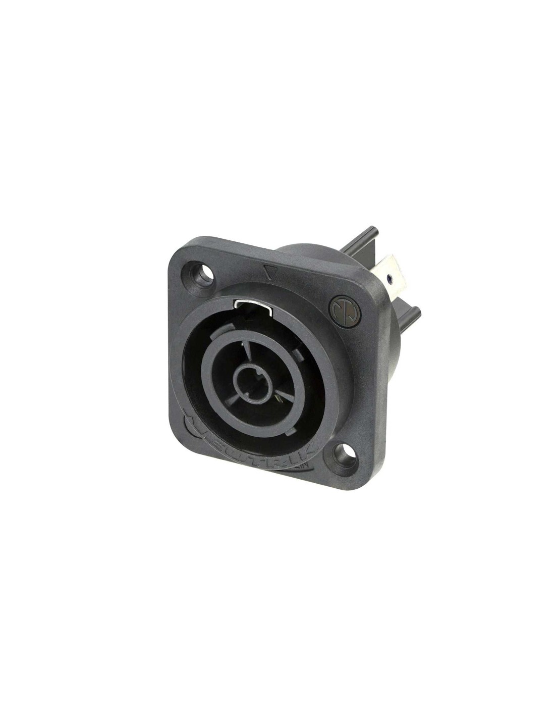 Conector de chasis powerCON hembra de 3 pines. Serie: powerCON TRUE1 TOP. Color: negro, contactos en plata. Conector de salida bloqueable con capacidad de interrupción de circuito (puede conectarse o desconectarse bajo carga o bajo tensión) para aplicaciones en exteriores. Intensidad nominal por contacto: 16 Amperios 250 V AC. Diseño extremadamente robusto y fiable, con sistema de bloqueo Twist Lock rápido y sencillo. Fabricado con materiales de alto impacto resistentes a los rayos UV. Especificaciones mecánicas: terminales de pestaña plana de 1/4. Materiales: carcasa de poliamida. Especificaciones ambientales: inflamabilidad UL 94 V-0, protección IP 65 UL50E4 en combinación con SCNAC-FPX (acoplado o con tapa cerrada), rango de temperatura -30 °C a +80 °C.