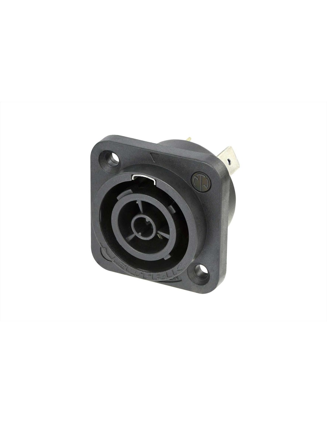Conector de chasis powerCON hembra de 3 pines. Serie: powerCON TRUE1 TOP. Color: negro, contactos en plata. Conector de salida bloqueable con capacidad de interrupción de circuito (puede conectarse o desconectarse bajo carga o bajo tensión) para aplicaciones en exteriores. Intensidad nominal por contacto: 16 Amperios 250 V AC. Diseño extremadamente robusto y fiable, con sistema de bloqueo Twist Lock rápido y sencillo. Fabricado con materiales de alto impacto resistentes a los rayos UV. Especificaciones mecánicas: terminales de pestaña plana de 1/4, sin separador de aislamiento. Materiales: carcasa de poliamida. Especificaciones ambientales: inflamabilidad UL 94 V-0, protección IP 65 UL50E4 en combinación con SCNAC-FPX (acoplado o con tapa cerrada), rango de temperatura -30 °C a +80 °C.