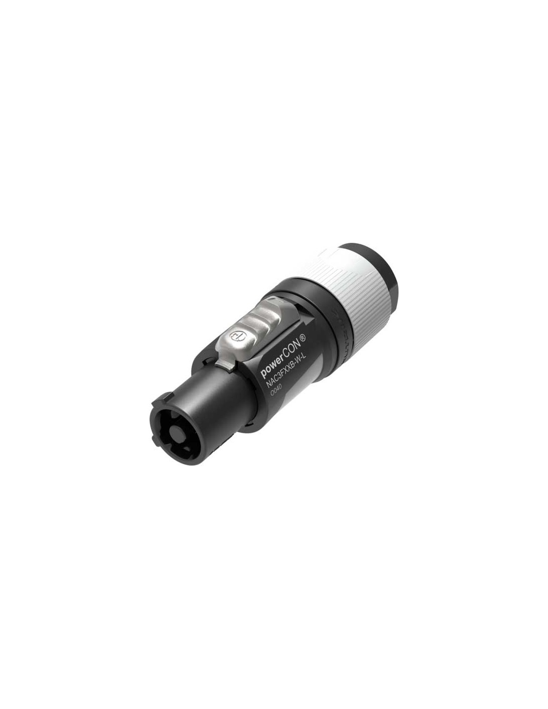 Conector aéreo powerCON hembra de 3 pines. Serie: powerCON blue/grey Color: negro, contactos en plata. Código de color (gris) para salida de alimentación. Diseñado para cables de 10 a 16 mm. Conector monofásico bloqueable con capacidad de interrupción de circuito cuando se acopla con receptáculos de la serie powerCON XX. Diseño extremadamente robusto y fiable, con sistema de bloqueo Twist lock. Especificaciones mecánicas: diámetro exterior del cable 10 – 16 mm, terminales de tornillo. Materiales: carcasa de poliamida. Especificaciones ambientales: inflamabilidad UL 94 V-0, protección IP 20, rango de temperatura -33 °C a +80 °C.