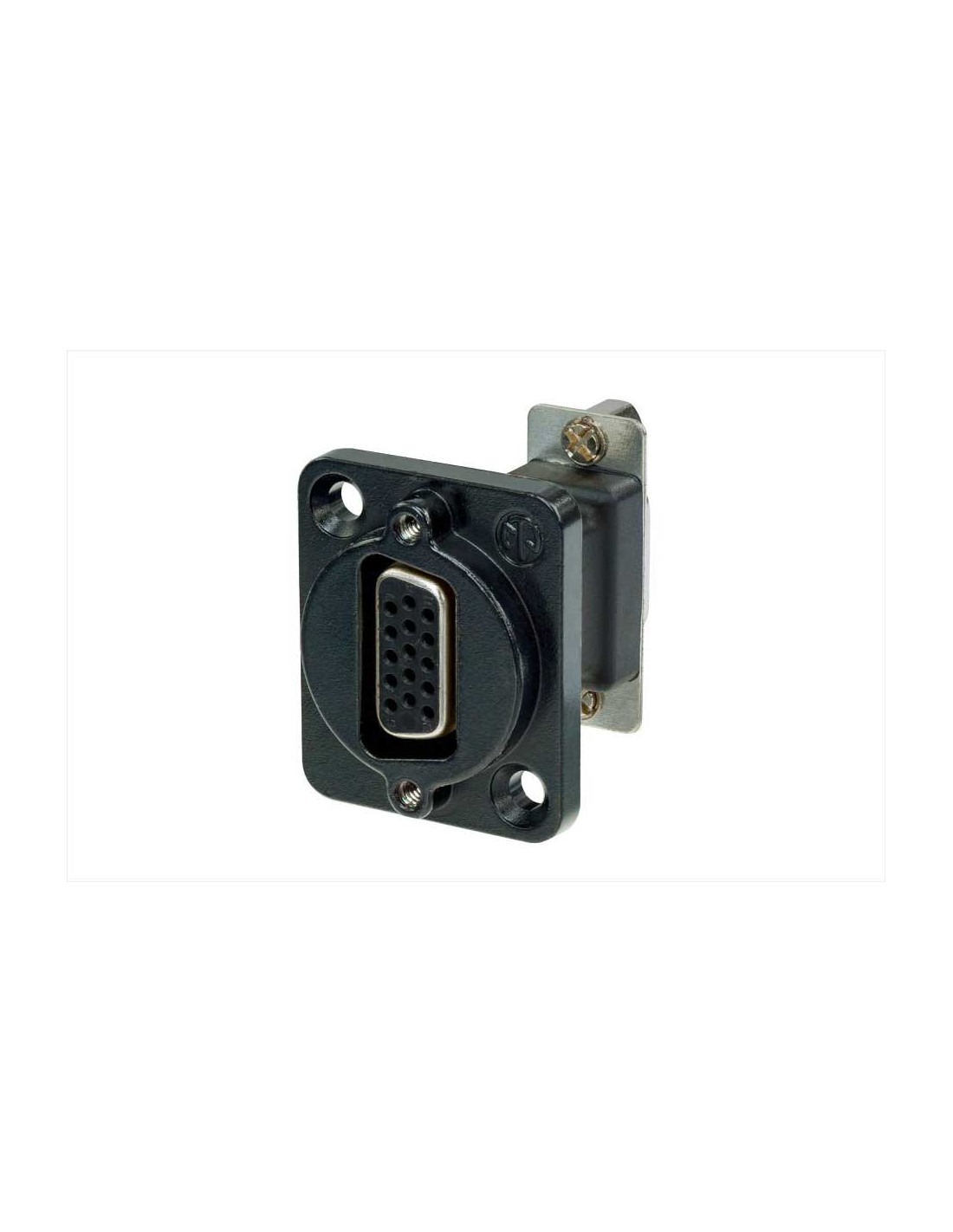 Conector de chasis D-SUB hembra a hembra de 15 pines. Adaptador paso a través para conversión de género. Serie NAD. Color: negro, contactos en oro. Chasis en forma de D estándar. Ideal para redes de audio e integración de equipos en sistemas de vídeo. Especificaciones mecánicas: espesor del panel de 4 mm. Materiales: carcasa de zinc, inserto de acero estañado y PBT. Especificaciones ambientales: inflamabilidad UL 94-V0, rango de temperatura -25 °C a +80 °C.