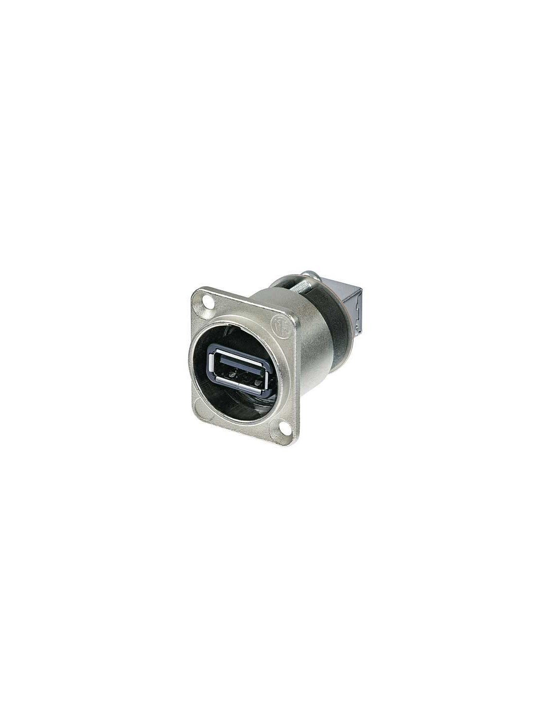 Conector de chasis USB 2.0 hembra. Adaptador paso a través reversible para conversión de género A-B (B-A). Serie NAUSB. Color: níquel, contactos en oro. Chasis en forma de D. Ideal para redes de audio e integración de equipos informáticos en sistemas de audio. Adaptador reversible que ofrece el tipo A o B en la parte delantera o trasera. Protección IP65 en estado acoplado con junta de estanqueidad NK USB y SCDP. Materiales: carcasa de zinc, inserto de PVC. Especificaciones ambientales: inflamabilidad UL 94 V-0, rango de temperatura -25 °C a +85 °C.