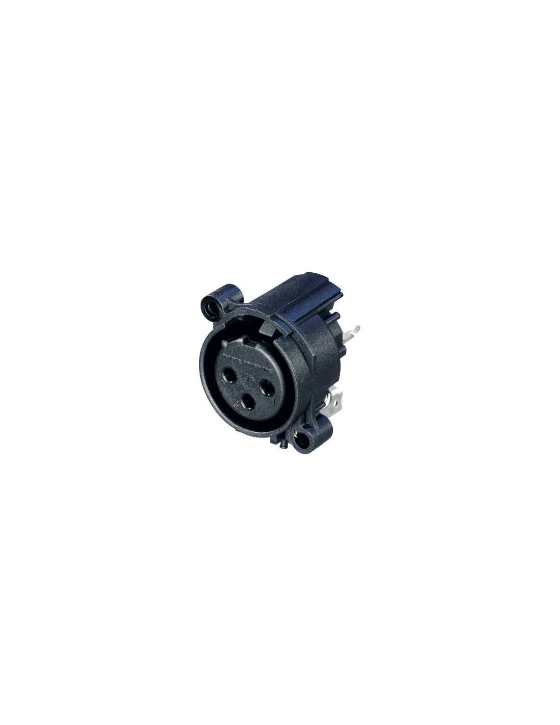 Conector de chasis XLR hembra de 3 pines. Serie AA. Color: negro, contactos en oro. Montaje horizontal en PCB. Cuerpo redondo de plástico más rentable. Sin conexión a tierra. Diseño de contacto tipo Tulipán con alta presión de contacto para una durabilidad máxima. Recorte del panel frontal y diseño de PCB 100% compatible con la serie A. Integra resorte de retención en lugar de pestillo. Materiales: carcasa de poliamida. Especificaciones ambientales: inflamabilidad UL 94 HB, norma IEC 61076-2-103, protección IP 40, rango de temperatura -30 °C a +80 °C.