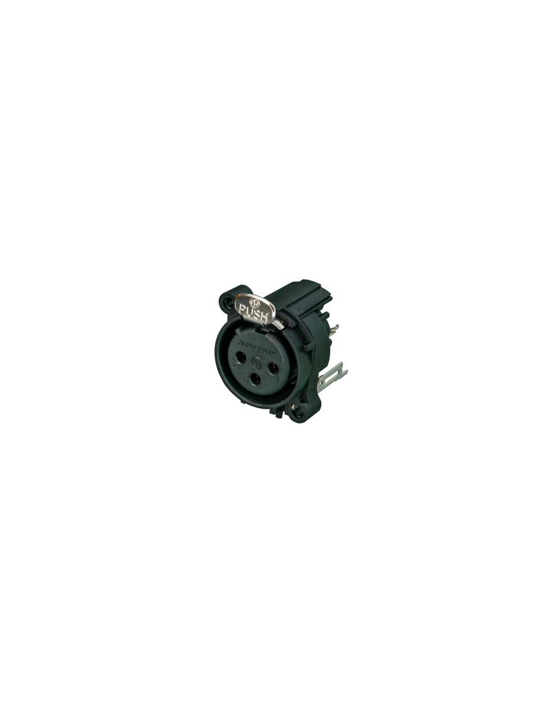 Conector de chasis XLR hembra de 3 pines. Serie AA. Color: negro, contactos en oro. Montaje vertical en PCB. Cuerpo redondo de plástico más rentable. Conexión a tierra: contacto de tierra separado conectado a la carcasa del conector y al panel frontal, sin conexión al pin 1. Diseño de contacto tipo Tulipán con alta presión de contacto para una durabilidad máxima. Recorte del panel frontal y diseño de PCB 100% compatible con la serie A. Pestillo de bloqueo montado. Materiales: carcasa de poliamida. Especificaciones ambientales: inflamabilidad UL 94 HB, norma IEC 61076-2-103, protección IP 40, rango de temperatura -30 °C a +80 °C.