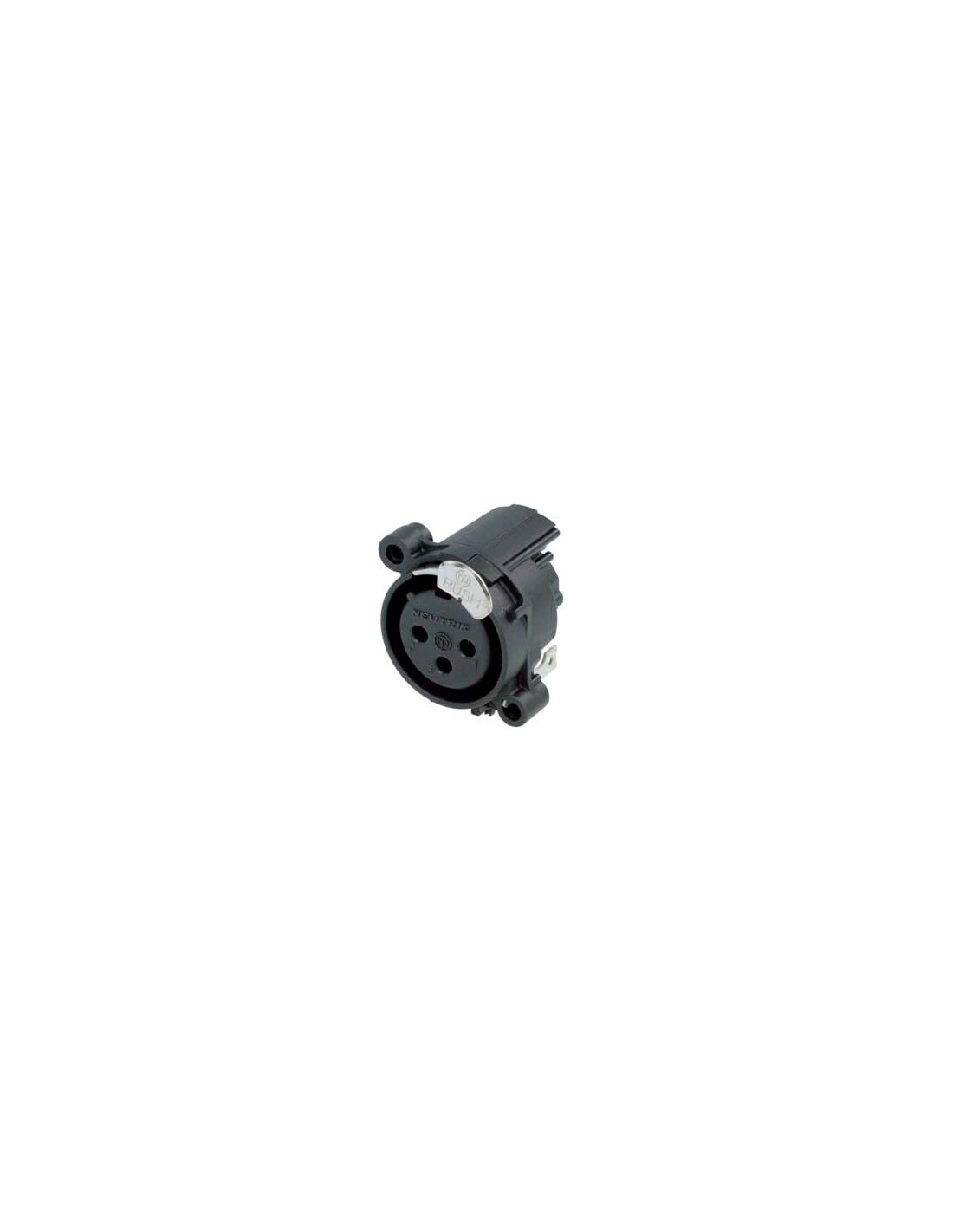 Conector de chasis XLR hembra de 3 pines. Serie A. Color: negro, contactos en oro. Montaje horizontal en PCB. Cuerpo redondo de plástico más rentable. Conexión a tierra: contacto de tierra separado conectado a la carcasa del conector y al panel frontal, sin conexión al pin 1. Receptáculos XLR más pequeños, mayor densidad de empaquetado (23 mm entre centros). Diseño de contacto tipo Tulipán con alta presión de contacto para una durabilidad máxima. Recorte del panel frontal y diseño de PCB 100% compatible con la serie A. Sistema de pestillo de empuje asimétrico que permite un ahorro de espacio de alrededor un 20 %. Materiales: carcasa de poliamida. Especificaciones ambientales: inflamabilidad UL94 V-0, norma IEC 61076-2-103, protección IP 40, rango de temperatura -30 °C a +80 °C.