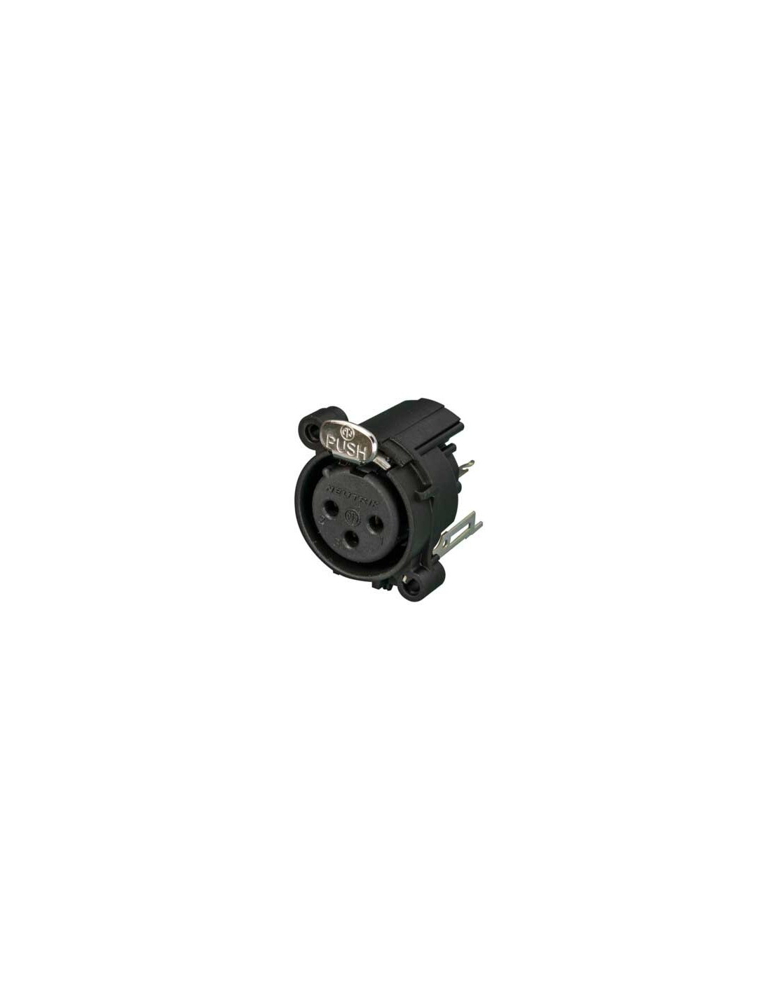 Conector de chasis XLR hembra de 3 pines. Serie A. Color: negro, contactos en oro. Montaje vertical en PCB. Cuerpo redondo de plástico más rentable. Conexión a tierra: contacto de tierra separado conectado a la carcasa del conector y al panel frontal, sin conexión al pin 1. Receptáculos XLR más pequeños, mayor densidad de empaquetado (23 mm entre centros). Diseño de contacto tipo Tulipán con alta presión de contacto para una durabilidad máxima. Recorte del panel frontal y diseño de PCB 100% compatible con la serie A. Pestillo de bloqueo montado. Materiales: carcasa de poliamida. Especificaciones ambientales: inflamabilidad UL 94 V-0, norma IEC 61076-2-103, protección IP 40, rango de temperatura -30 °C a +80 °C.