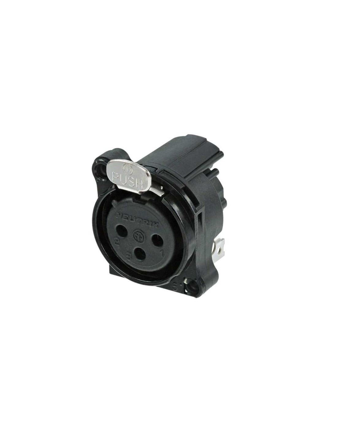 Conector de chasis XLR hembra de 3 pines. Serie B. Color: cromo negro, contactos en oro. Montaje horizontal en PCB. Conexión a tierra: Pin 1 conectado directamente al panel frontal y a la carcasa del conector, sin contacto a tierra independiente. Receptáculos XLR más pequeños, mayor densidad de empaquetado. Diseño de contacto tipo Tulipán con alta presión de contacto para una durabilidad máxima. Brida de montaje metálica que ofrece un contacto de tierra circunferencial continuo con el chasis para una mejor protección EMC y RF. Pestillo de bloqueo de acero Ck67. Materiales: inserto de poliamida, carcasa de zinc. Especificaciones ambientales: inflamabilidad UL 94 V-0, norma IEC 61076-2-103, protección IP 40, rango de temperatura -30 °C a +80 °C.