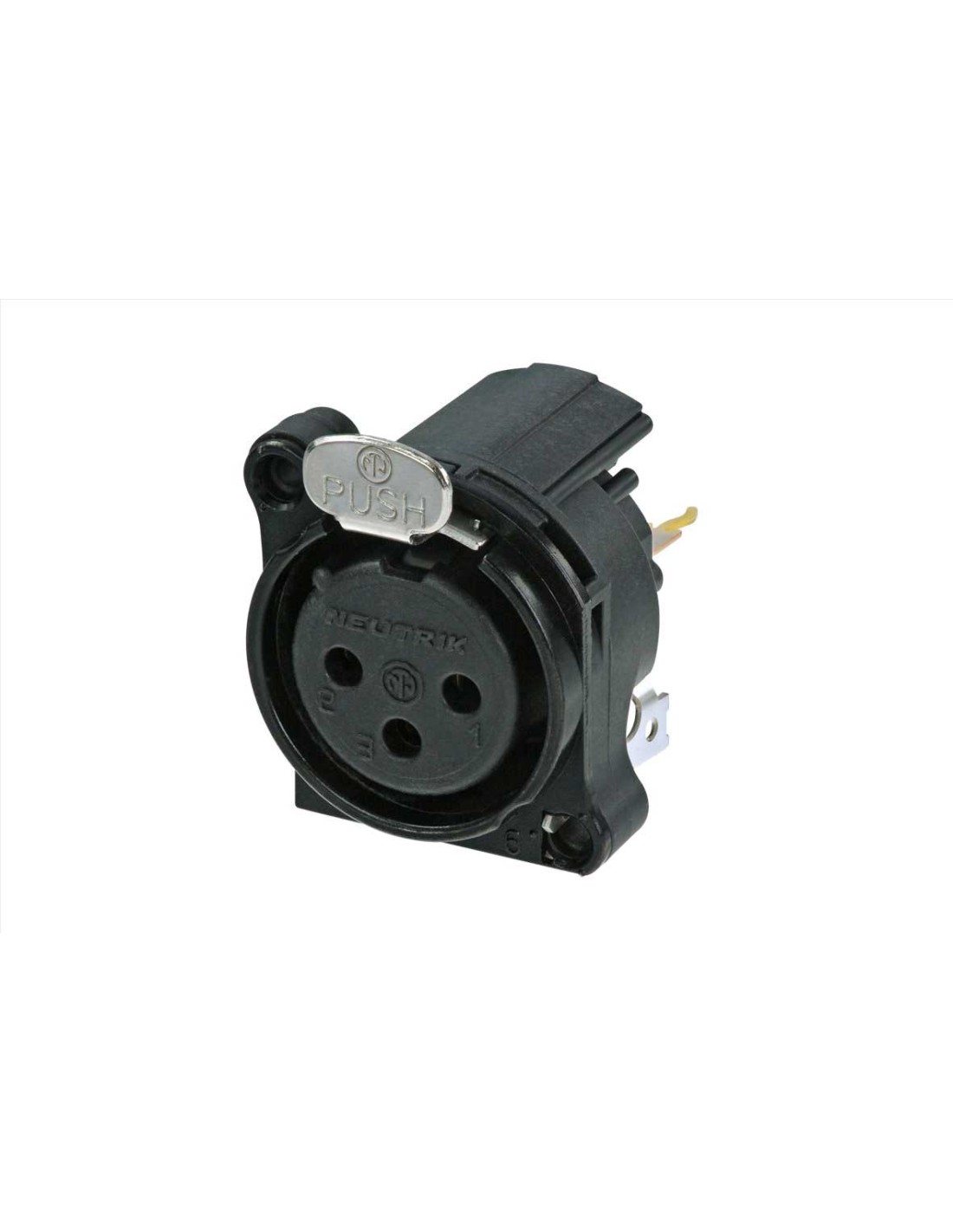 Conector de chasis XLR hembra de 3 pines. Serie B. Color: cromo negro, contactos en oro. Montaje vertical en PCB. Conexión a tierra: Pin 1 conectado directamente al panel frontal y a la carcasa del conector, sin contacto a tierra independiente. Receptáculos XLR más pequeños, mayor densidad de empaquetado. Diseño de contacto tipo Tulipán con alta presión de contacto para una durabilidad máxima. Brida de montaje metálica que ofrece un contacto de tierra circunferencial continuo con el chasis para una mejor protección EMC y RF. Pestillo de bloqueo de acero Ck67. Materiales: inserto de poliamida, carcasa de zinc. Especificaciones ambientales: inflamabilidad UL 94 V-0, norma IEC 61076-2-103, protección IP 40, rango de temperatura -30 °C a +80 °C.